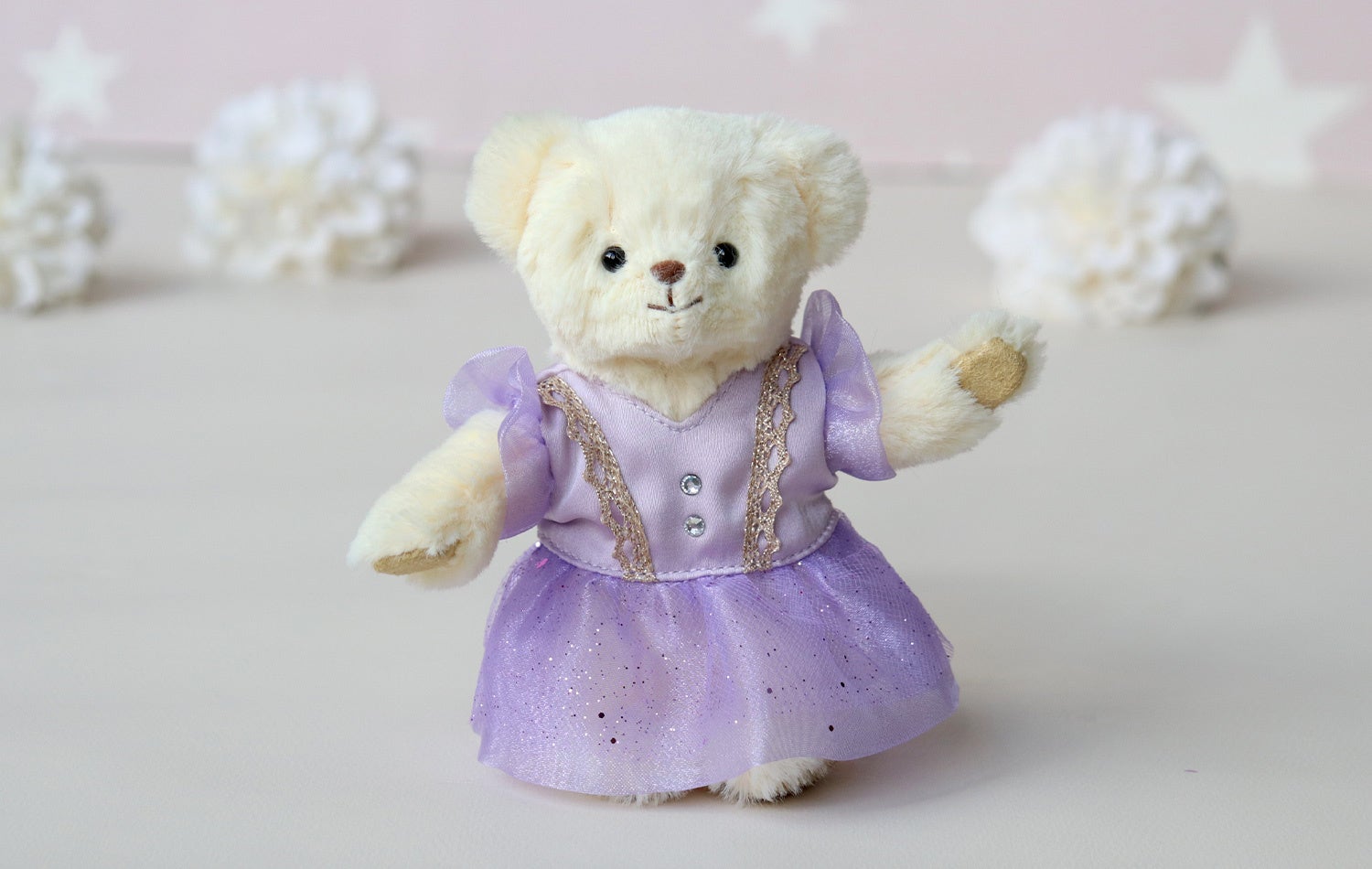 夏コレクションと同時に、特別な1日のための「ラベンダードレス」も発売。 ピアノの発表会、バレエの記念品、結婚式のウェルカムドールなど、人生の「ハレの日」に寄り添う一着です。繊細なレース使いと、動くたびにふんわりと輝くラメ入りのスカートが、小さな相棒をドラマチックに演出します。