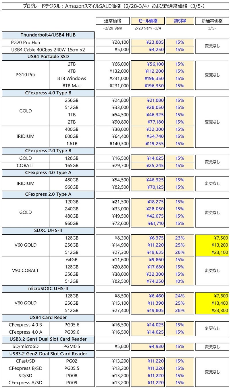 ProGrade Digital Inc.は、Amazon.co.jpで2月28日(金)午前9時から4日(火)に開催されるAmazonスマイルSALEに参加します。新価格およびセール価格の詳細は価格表を参照してください。ただし、セール価格は在庫がなくなり次第終了となります。