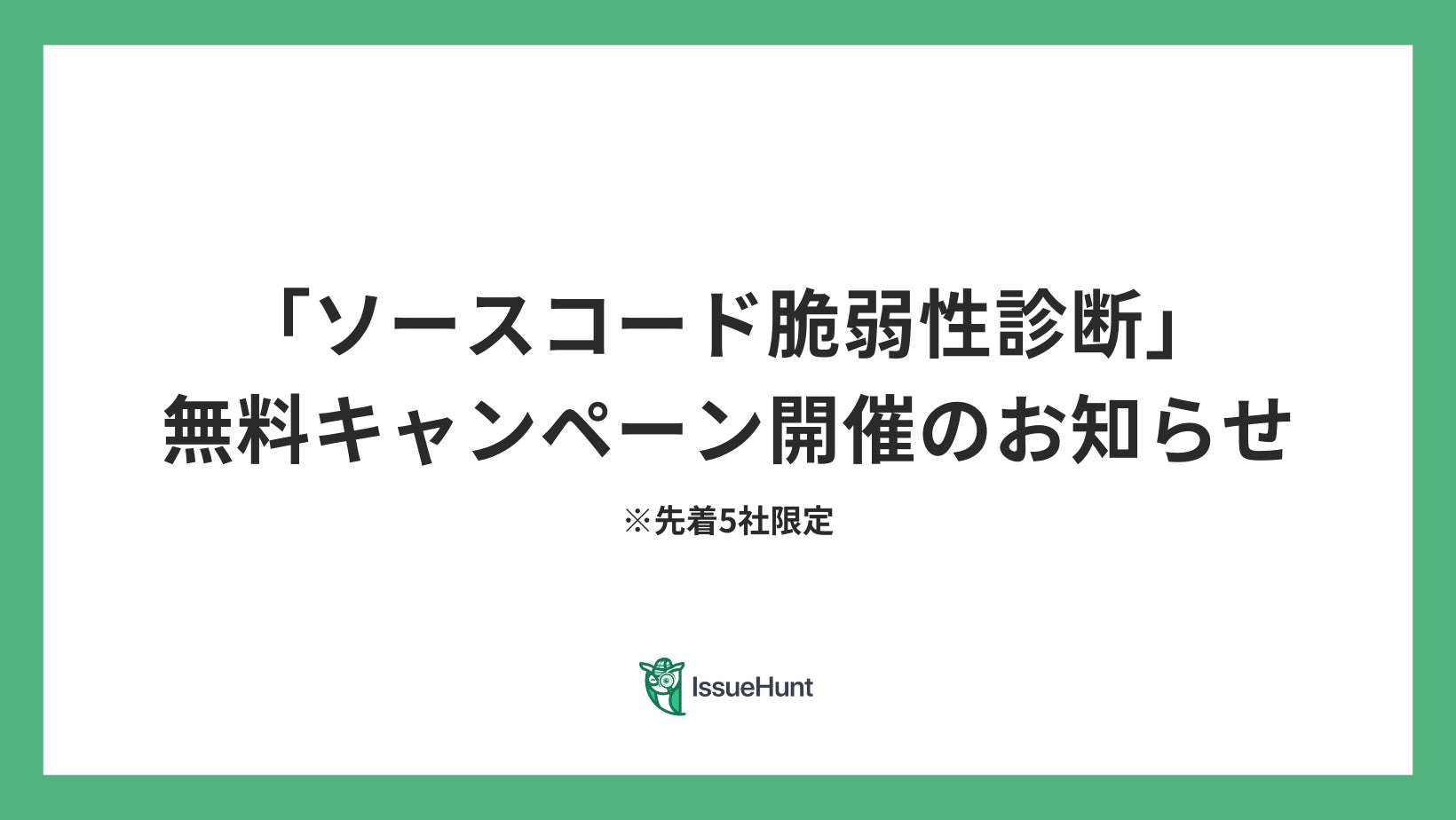 バグバウンティプラットフォーム「IssueHunt ( https://issuehunt.jp/ )」や、プロダクトセキュリティ支援サービス(https://issuehunt.jp/vst)等を提供するIssueHunt株式会社(本社:東京都中央区日本橋茅場町一丁目8番1号、代表取締役:横溝一将)は、「ソースコード脆弱性診断」の無料キャンペーンを開催することをお知らせいたします。
