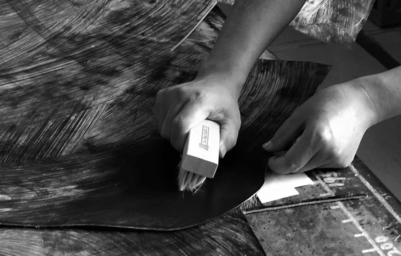 革繊維の芯まで、牛脂や蜜ロウを沁み込ます為に、革職人が手仕事で掛けるブラッシングの反復作業のお蔭で、