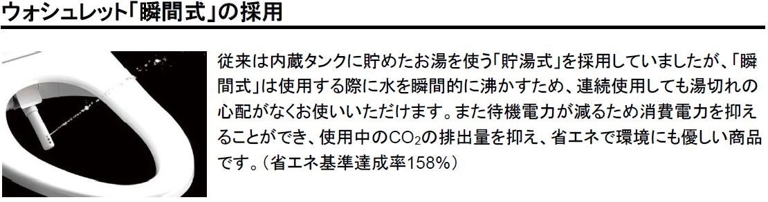 この度発売する、ベーシックモデルである「ウォシュレットSS」は、フタのヒンジがすっきりし、角の丸くなったよりシンプルでお手入れのしやすいデザインで清掃性が向上します。また、従来はおしり洗浄の際、内蔵タンクに貯めたお湯を使う「貯湯式」を採用していましたが、新商品では、水を瞬間的に沸かして適温にする「瞬間式」の採用で、湯切れの心配がなくさらに快適にお使いいただけます。また待機電力が減るため消費電力を抑えることができ、省エネにもなります。瞬間式の採用に加え、便座と便ふたの断熱構造で便座を挟み込むように保温する「ダブル保温便座」を搭載し放熱を抑え、高い環境配慮性能も実現しました。