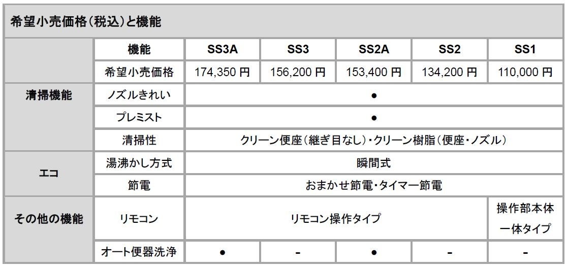 TOTO株式会社(本社:福岡県北九州市、社長:田村 信也)は、ウォシュレット※1「S」「SB」をフルモデルチェンジし、清掃性に優れた新デザインと、環境配慮性能を進化させ、新たに「ウォシュレットSS」として8月1日(金)に発売します。