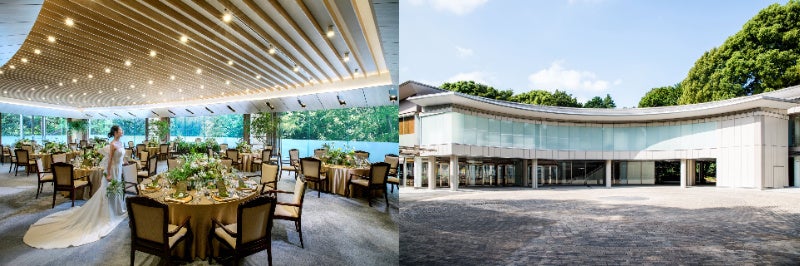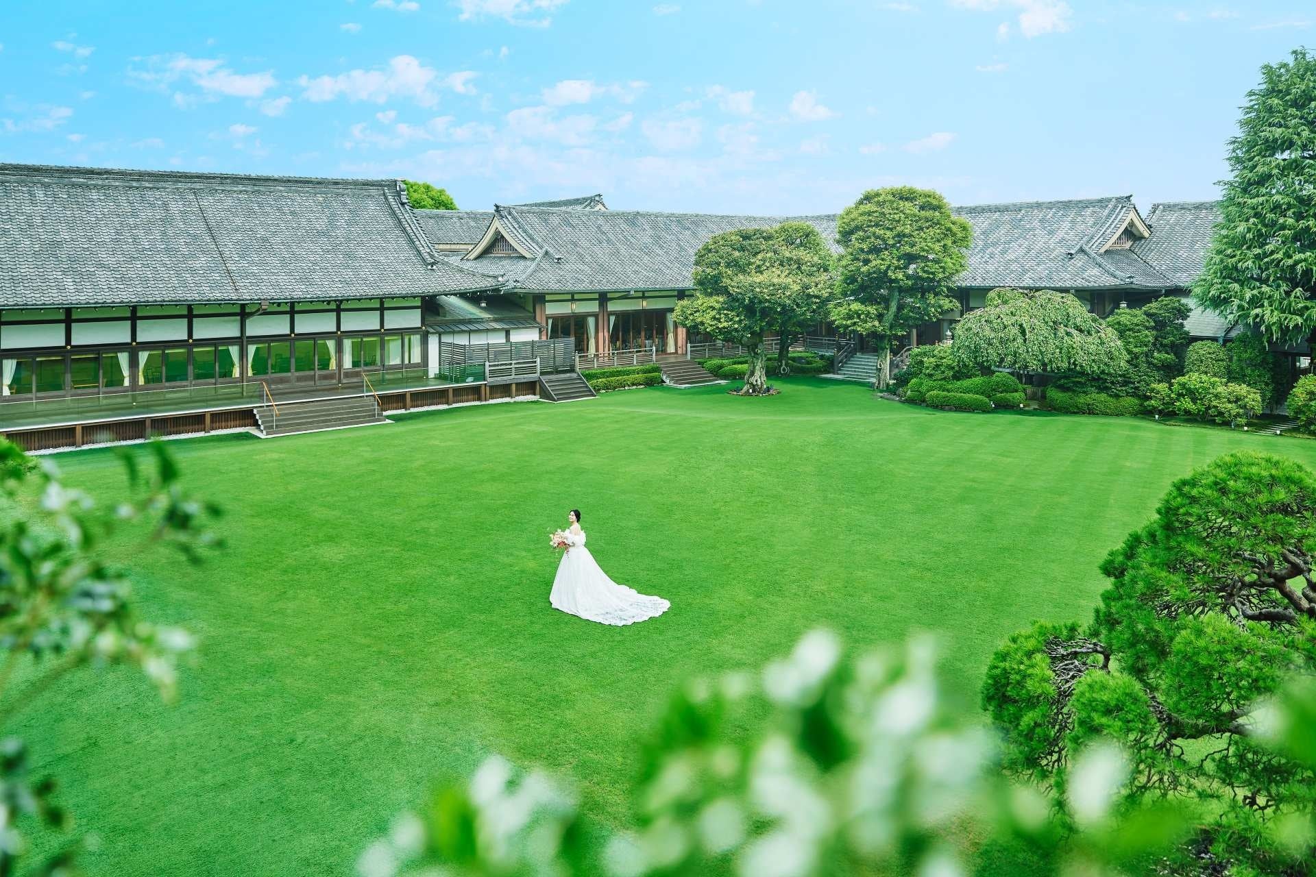 港区元赤坂にある明治記念館は、都心にありながら専任の庭師による手入れの行き届いた約1,000坪の庭園が人気の会場。ほとんどの披露宴会場から庭園が見渡せる絶好のロケーションを誇ります。
