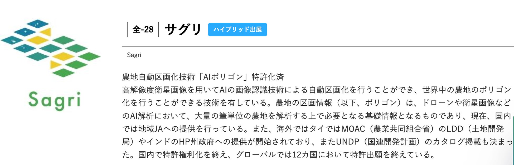 サグリ株式会社は、「人類と地球の共存を実現する」をビジョンに掲げ、2018年6月に兵庫県で創業したスタートアップ企業です。衛星データ×AIで世界の農業と環境課題の解決を目指しています。2021年6月にはリアルテックファンドなどから総額1.55億円の資金調達を発表しました。また、ひょうご神戸スタートアップファンドの第一号案件の出資となりました。令和3年度農林水産省 農林水産技術等大学発ベンチャーに認定され、近畿経済産業局より、J-Startup-KANSAIに選出。環境省スタートアップ大賞事業構想賞受賞や東洋経済2021すごいベンチャーに選出されました。タイやインドにも進出し、グローバルで活動しています。