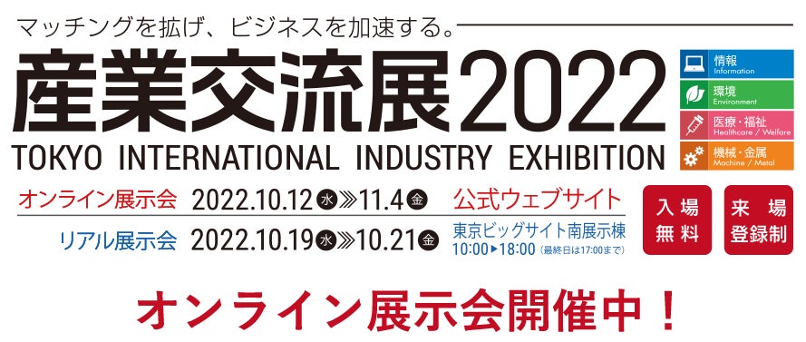産業交流展は、首都圏(東京都・埼玉県・千葉県・神奈川県)に事業所を有する、 個性あふれる中小企業などの優れた技術や製品を一堂に展示し、販路拡大、企業間連携の実現、 情報収集・交換などのビジネスチャンスを提供することを目的としています。当社は兵庫県ブースとして3区画にて展示いたします。