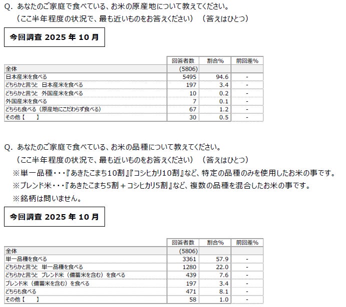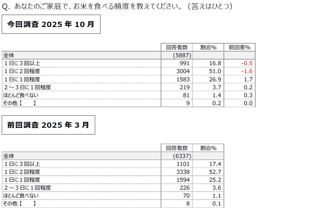 日本生協連では引き続き、主食であるお米の利用実態を把握し、生産者と産地との取り組みや応援に役立てるとともに、組合員の日々のくらしを支援することを目的として、全国の組合員を対象としたWEBアンケートを実施しました。(調査期間:2025年10月9日~10月14日、有効回答数:5,887件)