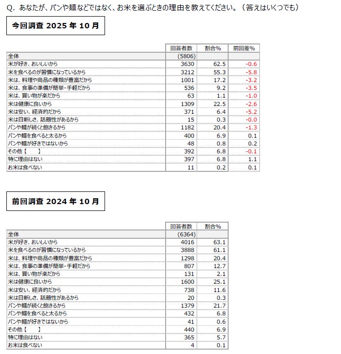 パンや麺などではなく、お米を選ぶときの理由について尋ねたところ、「米が好き、おいしいから(62.5%)」、「米を食べるのが習慣になっているから(55.3%)」が回答の上位にランクインしました。前回調査と比較すると、「米を食べるのが習慣になっているから(55.3%)」は5.8%減少、「米は安い、経済的だから(6.4%)」は5.2%減少しました。直近の米不足や米価高騰が如実に影響したものと推測します。