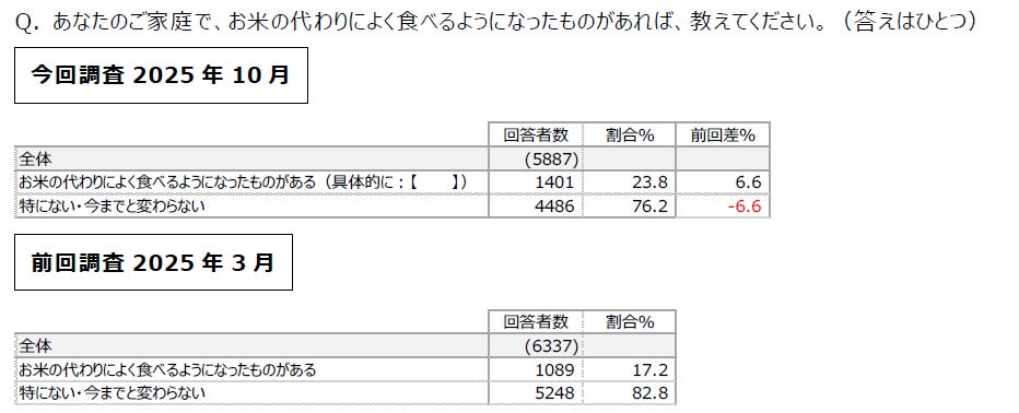 お米の代わりによく食べるようになったものは「特にない・今までと変わらない(76.2%)」が最多。「ある(23.8%)」は前回調査よりも+6.6%増加。具体的な品目は「パン」「うどん」「パスタ」など。