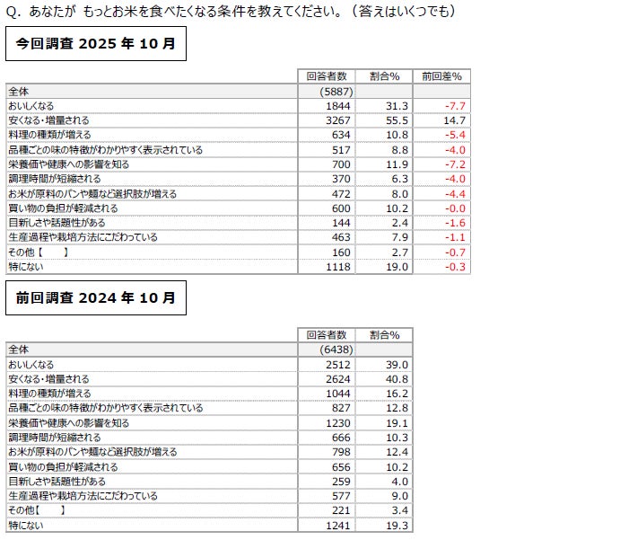 もっとお米を食べたくなる条件について尋ねたところ、「安くなる・増量される(55.5%)」が第1位をキープし、前回調査よりも14.7%の大幅増加となりました。次点である「おいしくなる(31.3%)」の7.7%減少を筆頭に、その他の回答はすべて減少に転じており、米価高騰への切迫感を印象づける結果となりました。