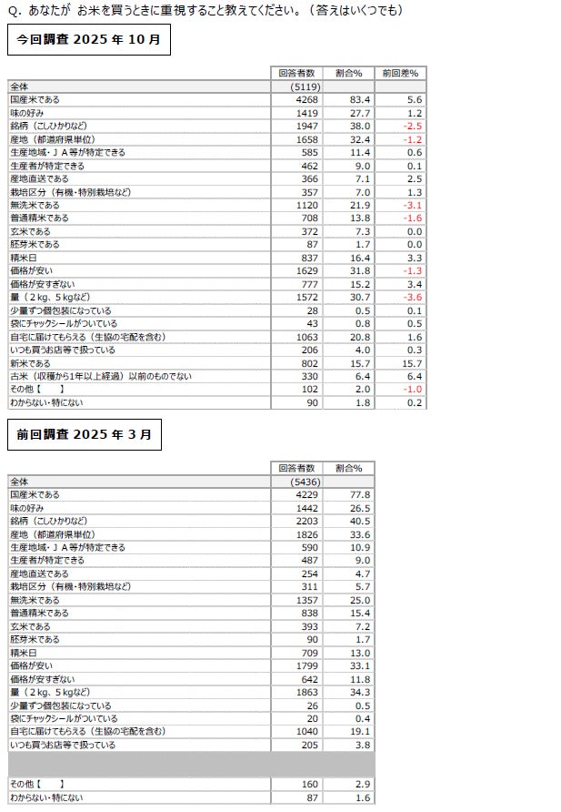 お米を買うときに重視することは「国産米である(83.4%)」が圧倒的多数。消費者の譲れない「こだわり」が明らかに。
