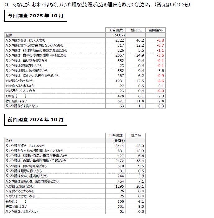 お米ではなく、パンや麺などを選ぶときの理由について尋ねたところ、「パンや麺は安い、経済的だから(9.4%)」は+5.6%増加しました。選ぶ際に安さ・経済性を理由とする点については、調査開始以降初めて、「米(6.4%)」を「パンや麺(9.4%)が逆転する結果となりました。