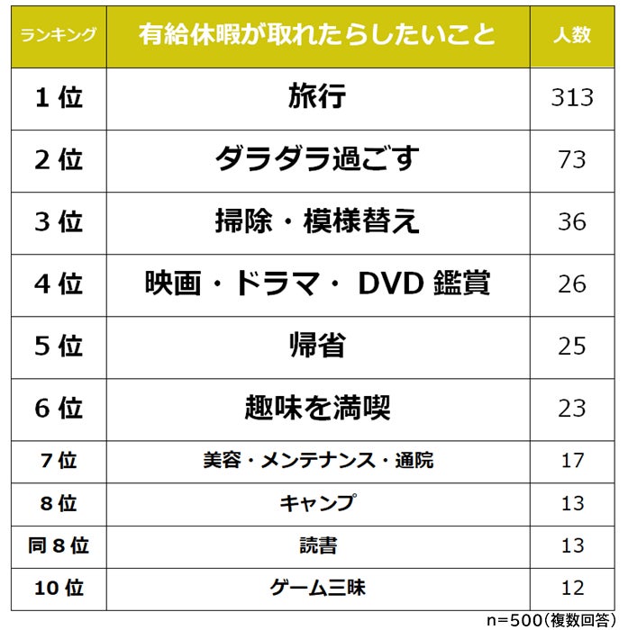 【有給休暇が取れたらしたいことランキング】男女500人アンケート調査