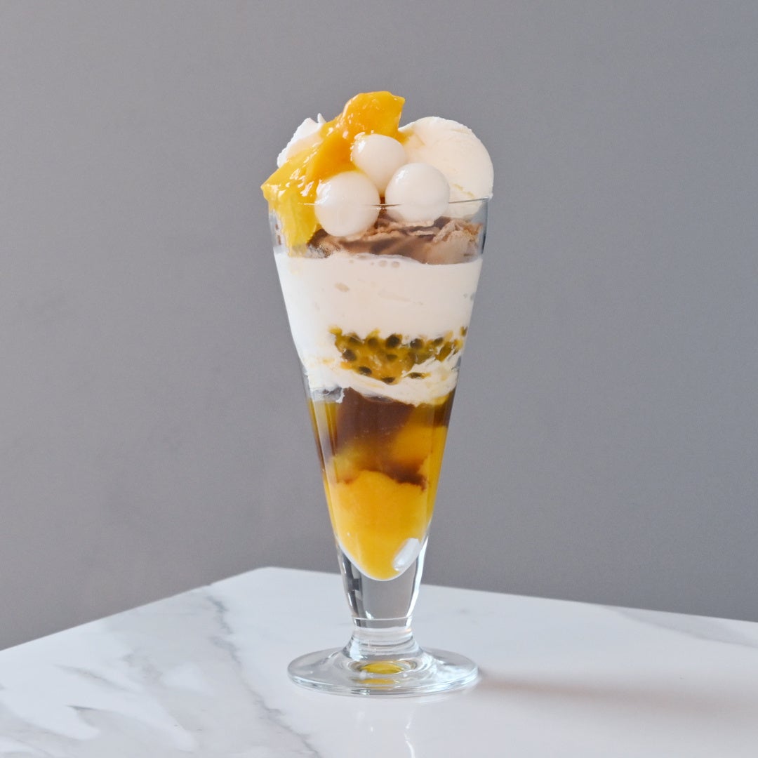 マンゴーの濃厚な甘さに、パッションフルーツの酸味がアクセントのマンゴーパッションパフェ。マンゴーとパッションフルーツ、ココナッツアイスと南国を感じさせる組み合わせに、オリジナルのチャイゼリーをトッピング。チャイゼリーは、紅茶にシナモンやグローブなどのスパイスが入っている香り高いゼリーです。甘すぎず最後までさっぱりとお召し上がりいただけます。