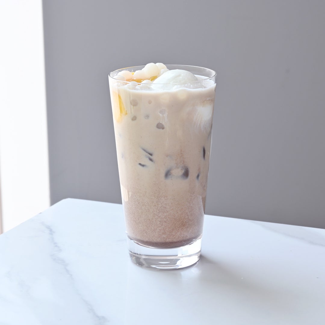 紅茶にスパイスを加えたオリジナルのチャイミルクに、ジューシーなマンゴーソースとまろやかなココナッツアイスをトッピング。もちもち食感の粒白玉もアクセントに。