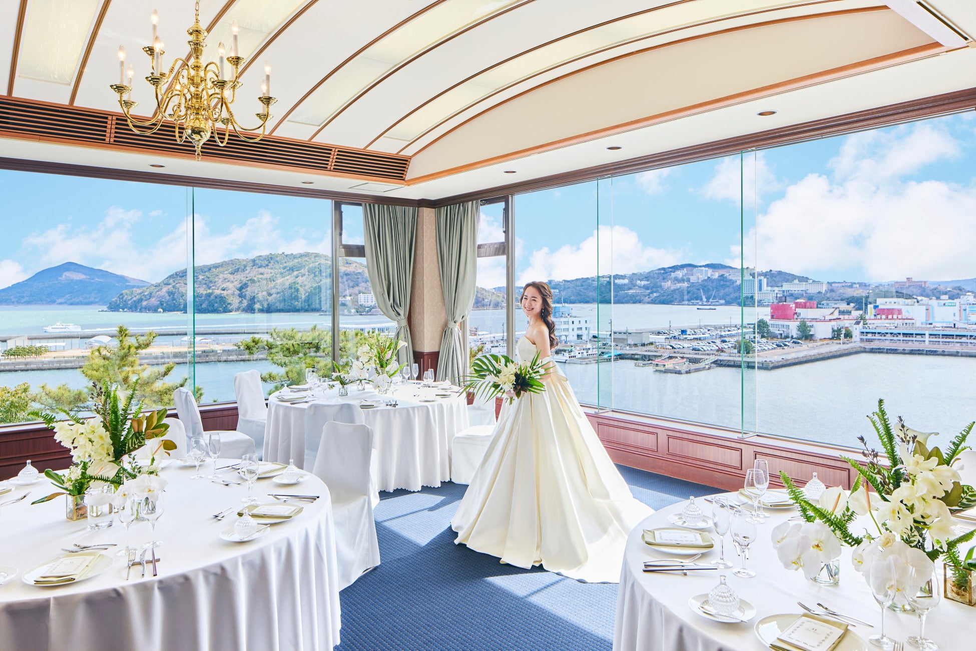 披露宴は、ご人数に合わせ大小さまざまな会場をご用意。ご家族だけのアットホームな会食や、カジュアルなパーティー、大人数の披露宴まで、参列人数に応じてご提案をさせていただきます。全ての会場からは、鳥羽湾の美景も望められるので、絶景という演出もプラスされ、おふたりの思いや個性に合わせたコーディネートも叶います。