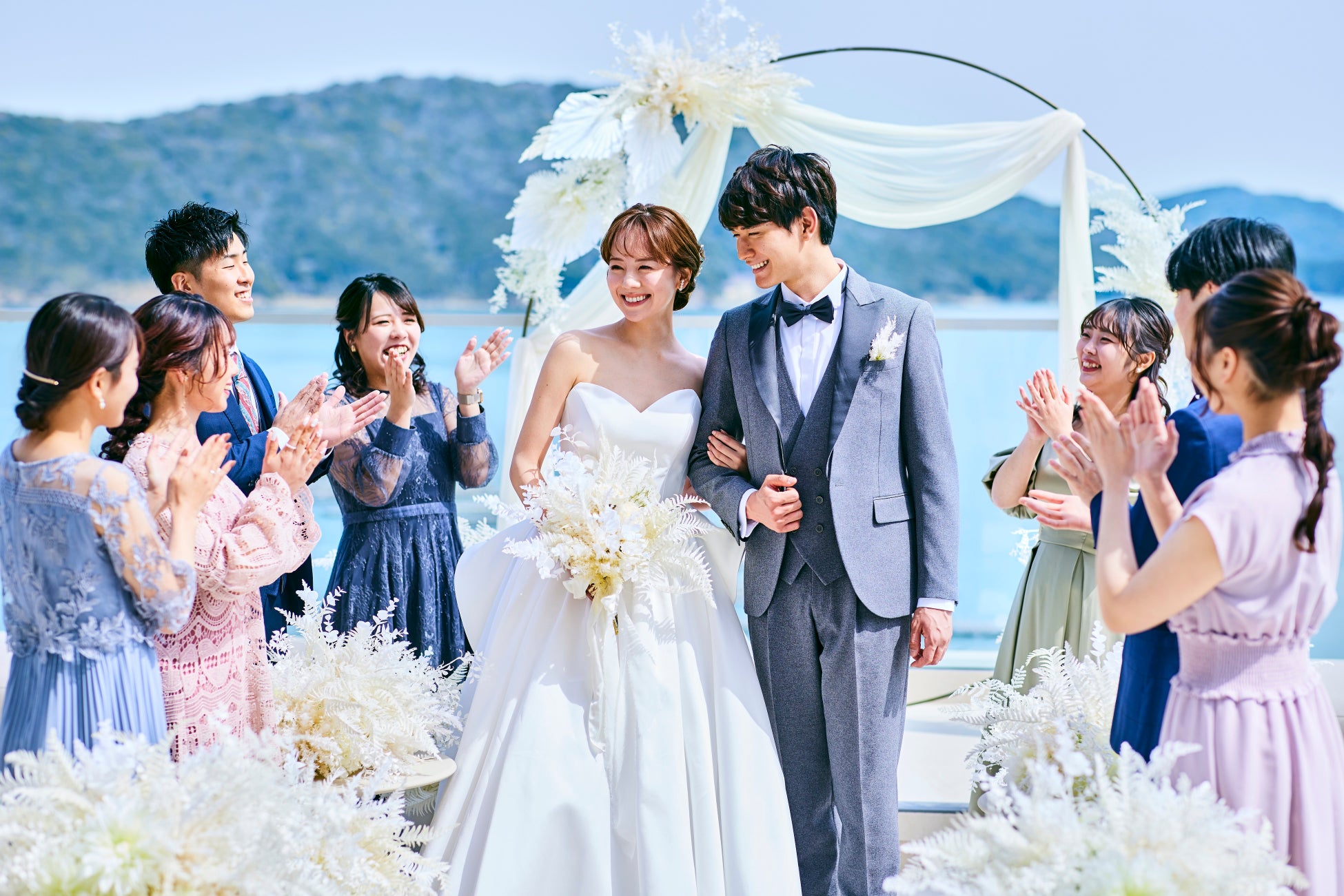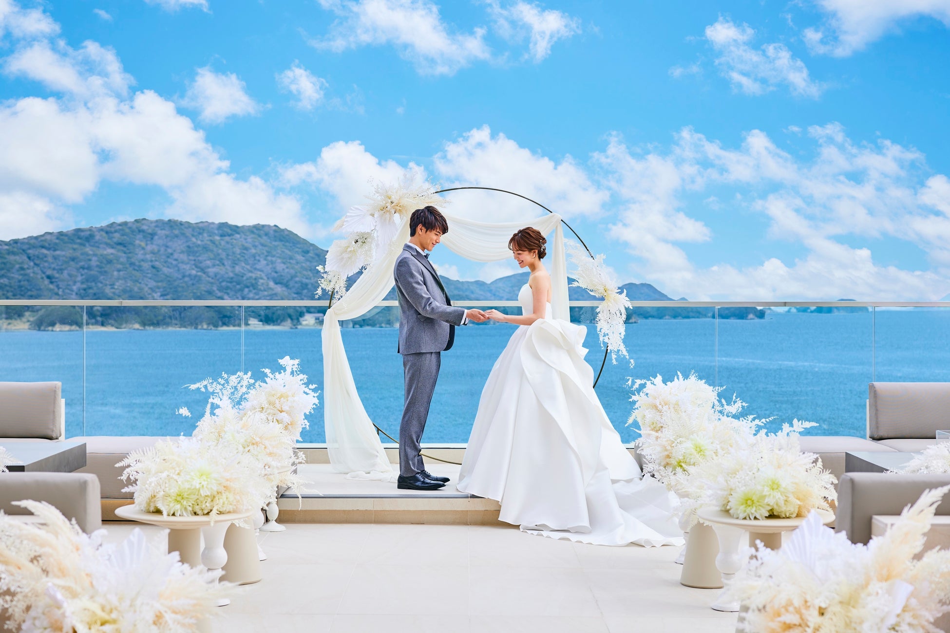 鳥羽国際ホテルでは、オーシャンビューの絶景が魅力のテラス挙式をはじめ、ガーデンセレモニーや、真珠をイメージしたパールホワイトのチャペルの挙式、二見興玉神社での神前式など、おふたりにあった挙式をお選びいただけます。