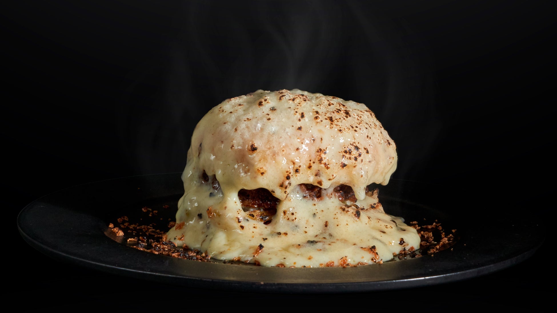 プラントべースのパティやモッツァレラチーズ風味のマッシュポテト、グリルオニオン、ほうれん草などたっぷりの具材をバンズでサンド。香ばしくバーナーで炙り、白トリュフオイルが香る、濃厚なプラントベースチーズに包まれたリッチなハンバーガーです。別添えの、ガーリックオイルで香ばしく炒めたパン粉や、フルーティーな酸味とコクのある赤ワインソースを途中でプラスし、食感や味の変化をお楽しみください。