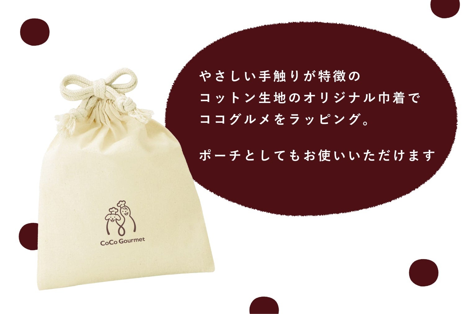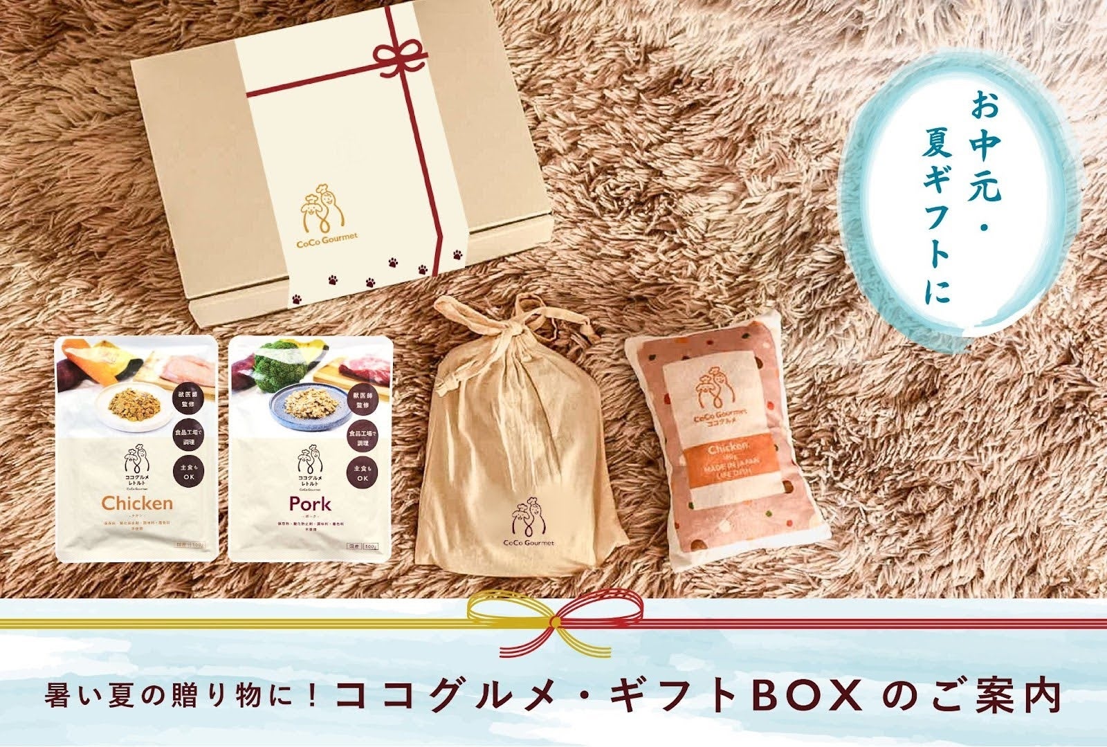夏はお中元やサマーギフトなど、日頃お世話になっている方への感謝の気持ちを伝えたり、お盆や夏休みなどで帰省する機会も増えるシーズンです。ココグルメ・レトルトは人が食べられるほどの品質で作られており、水分量を70%以上含むため食事から水分補給ができ、国産食材本来の甘みと昆布だしの旨味が口の中で広がるおいしさが楽しめる、食欲が落ちがちな真夏のギフトにぴったりです。ごはんだけでなく、おもちゃ、巾着、メッセージカード付きのスペシャルなセットです。大切な人やわんちゃんへの「いつもありがとう」という感謝の気持ちを伝える特別な贈り物にココグルメ・ギフトBOXをぜひお選びください。