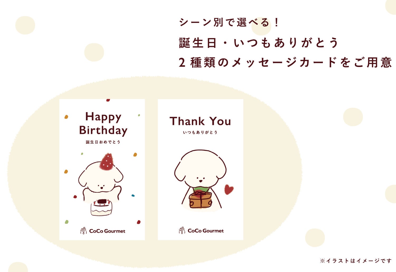 日頃お世話になっている人の愛犬へ贈るユニークなお中元やサマーギフトとして、帰省時の愛犬へのお土産として、暑さで食欲が落ちてしまいがちな夏にも愛犬とご家族が笑顔で元気に過ごせるよう、「ココグルメ・ギフトBOX」を贈りませんか?