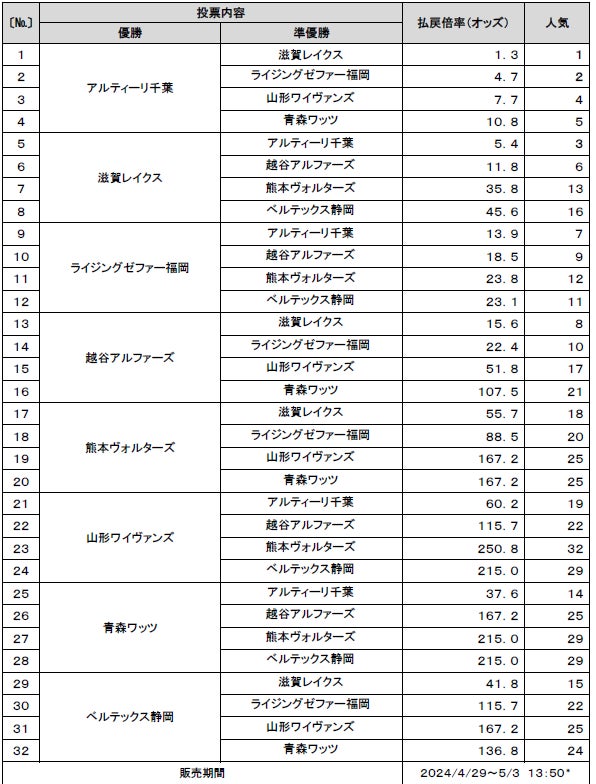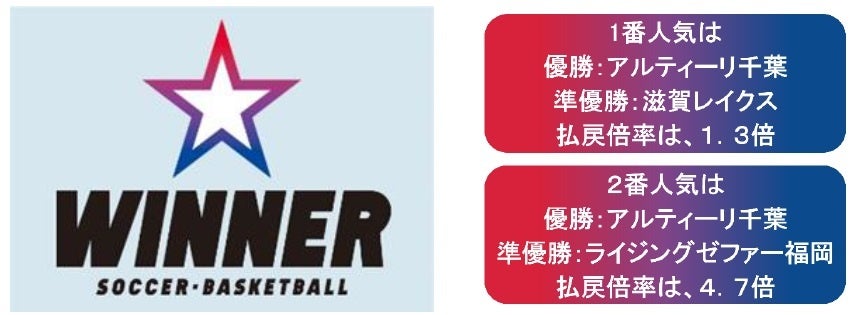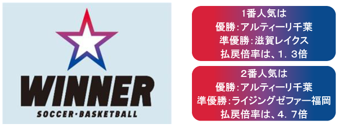 優勝・準優勝予想の1番人気は、優勝が東地区1位で歴代最高勝率を記録したレギュラーシーズン勝率93.3%のアルティーリ千葉、準優勝が西地区1位で同勝率73.3%の滋賀レイクスで、払戻倍率(オッズ)は1.3倍!2番人気は、優勝がアルティーリ千葉、準優勝が西地区2位で同勝率60%のライジングゼファー福岡で、払戻倍率(オッズ)は4.7倍、3番人気は、優勝が滋賀レイクス、準優勝がアルティーリ千葉で、払戻倍率(オッズ)は5.4倍、となっています。
