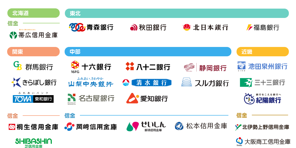 芝信用金庫、帯広信用金庫、岡崎信用金庫、北伊勢上野信用金庫、静清信用金庫、大阪商工信用金庫、松本信用金庫、玉島信用金庫