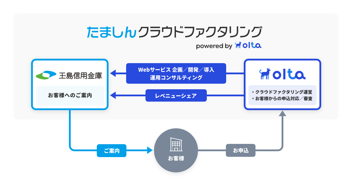 OLTAと玉島信用金庫とのクラウドファクタリング事業における提携では、OLTAがWebサービスの企画・開発・導入および運用におけるコンサルティングを玉島信用金庫に提供し、玉島信用金庫は法人・個人事業主のお客様にサービスをご案内します。