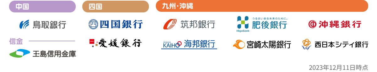 鳥取銀行、筑邦銀行、八十二銀行、肥後銀行、四国銀行、池田泉州銀行、秋田銀行、三十三銀行、愛媛銀行、北日本銀行、沖縄銀行