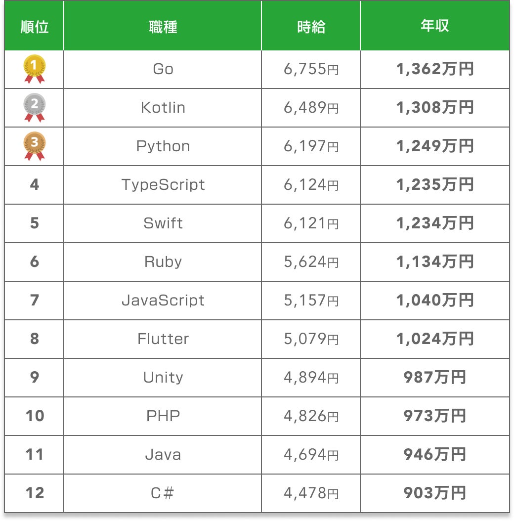 ・1位Goと12位C#の年収の差459万円