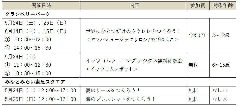また、東急線沿線6施設では、ハワイをテーマとした「トロピカルフェス」を同時開催。期間中、港北 TOKYU S.C.<バケット>の「ロコモコ風プレート」や、五反田東急スクエア<毎日パスタ>の「ハイビスカスレモネード」など、ハワイアンメニューを堪能できます。グランベリーパーク<ヤマハミュージックサロン/のびゆくこ>では、ウクレレキットに自由に絵を描きオリジナルのウクレレを作るワークショップを、<イッツコムスポット>では、小中学生向けオンラインプログラミング教材「イッツコムラーニング デジタネ」の無料体験会などを実施。みなとみらい東急スクエアでは、夏のリースや海のブレスレットを作ることができるワークショップを開催します。
