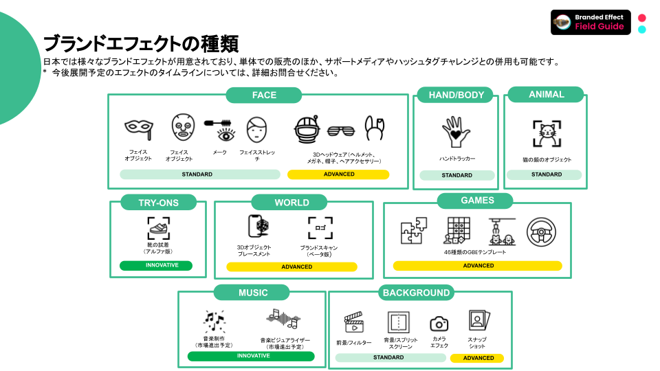 ブランドエフェクトにはさまざまな手法があり、人の顔や身体に変化を加えるものから、前景や背景に装飾ができるもの、ゲーム機能があるものなど、クリエイティブ機能は日々進化し、増え続けています。