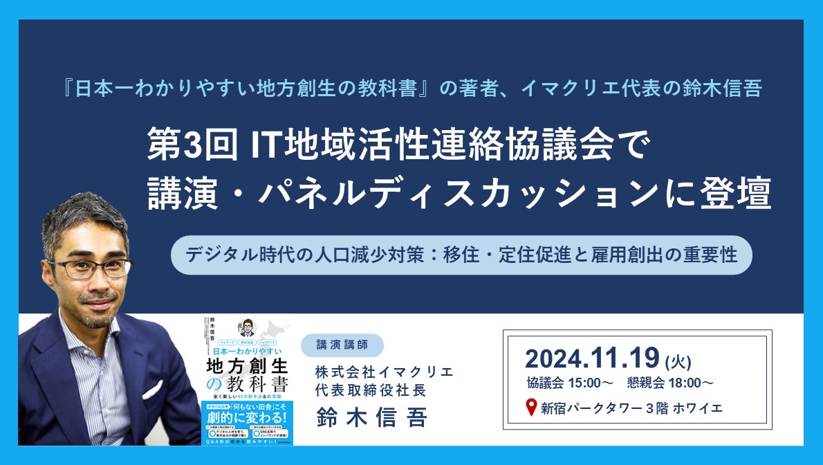 株式会社イマクリエ(本社:東京都港区、代表取締役:鈴木信吾、以下「当社」)は、2024年11月19日(火)に開催される第3回 IT地域活性連絡協議会で、当社代表取締役の鈴木信吾が講演およびパネルディスカッションに登壇することをお知らせします。