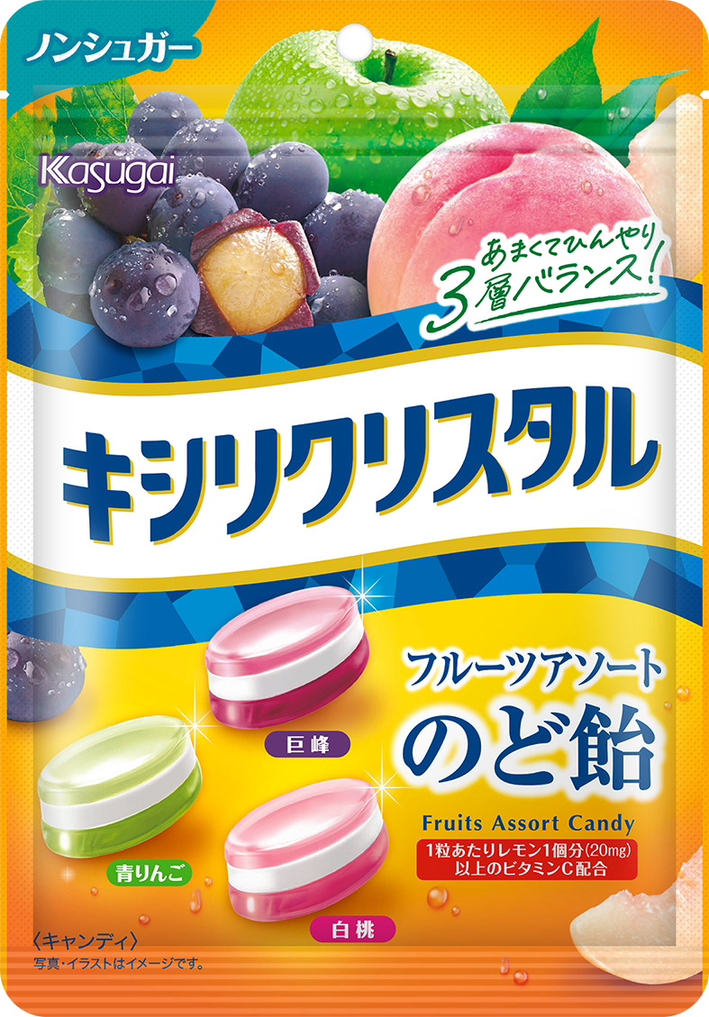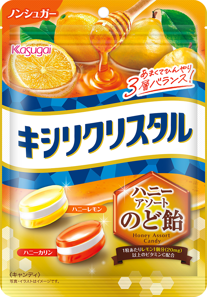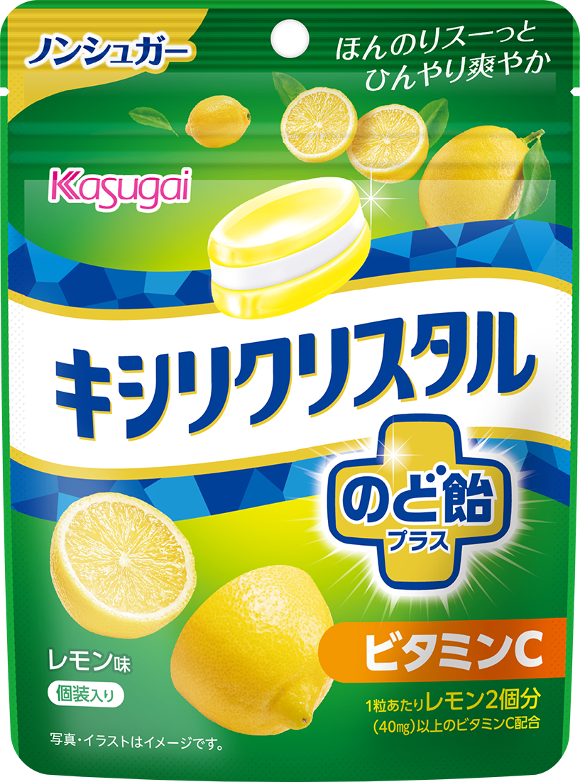 キシリトール層のひんやりと、ほんのりスーっとする味わいがマッチした3層ノンシュガーのど飴です。1粒にレモン2個分以上のビタミンC配合の「キシリクリスタルのど飴プラス ビタミンC」と、ミントポリフェノール配合の「キシリクリスタルのど飴プラス ポリフェノール」の2品を同時に展開します。