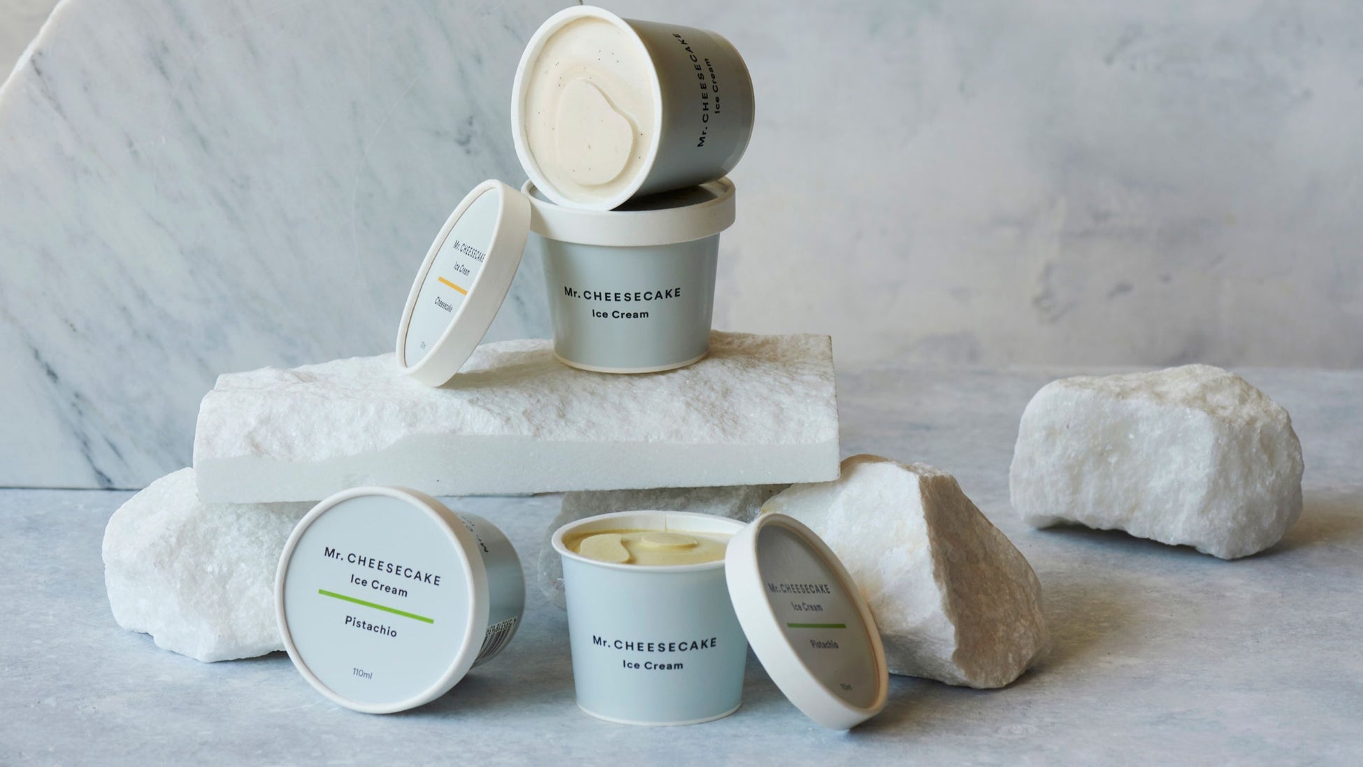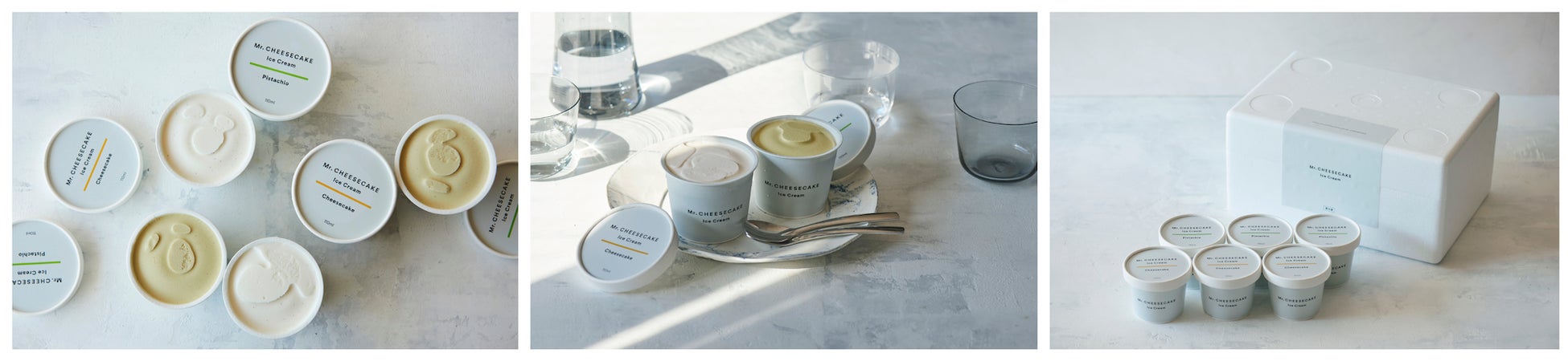 Mr. CHEESECAKEの通常フレーバーをイメージした「Mr. CHEESECAKE Ice Cream Cheesecake」と、ピスタチオをふんだんに使用した「Mr. CHEESECAKE Ice Cream Pistachio」の2フレーバーを3個ずつセットにしてお届けします。