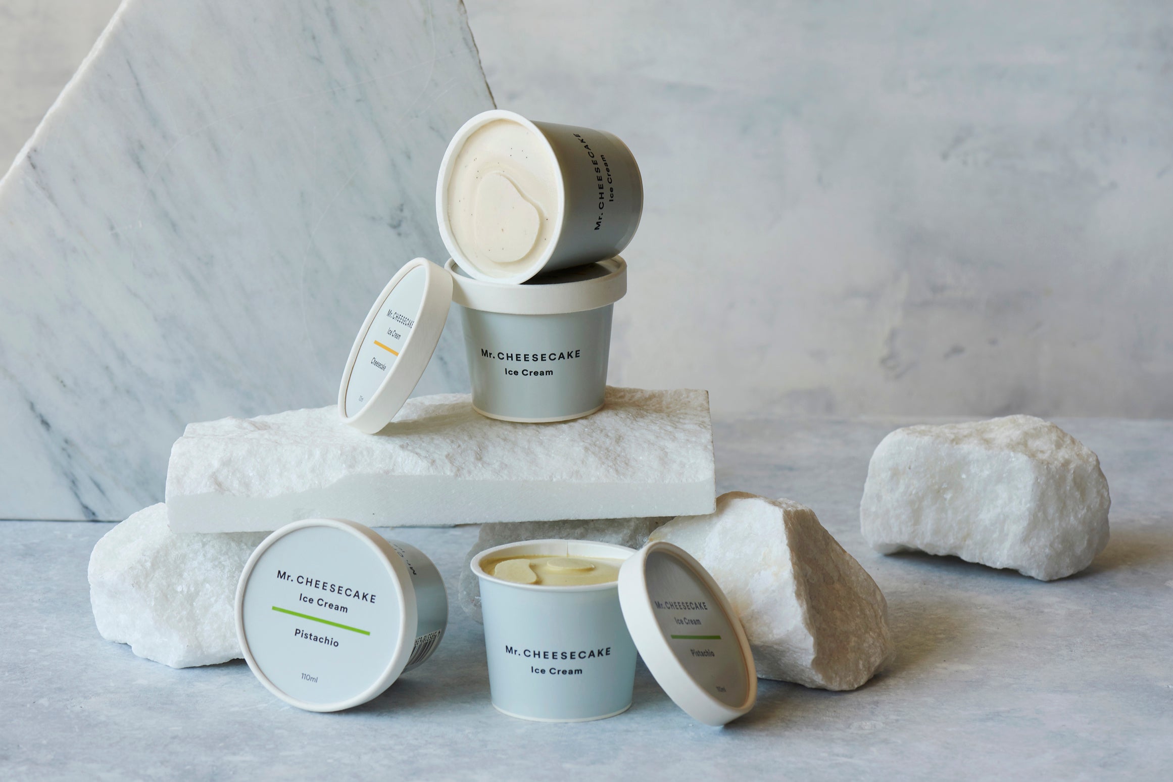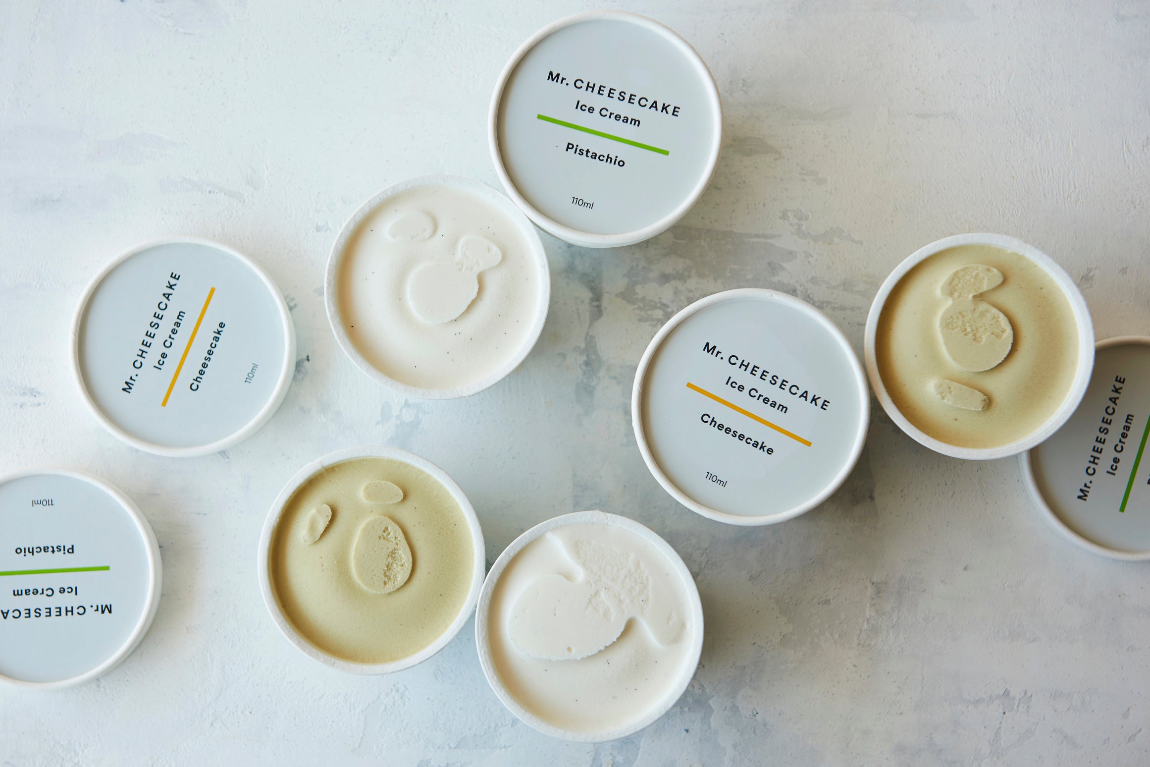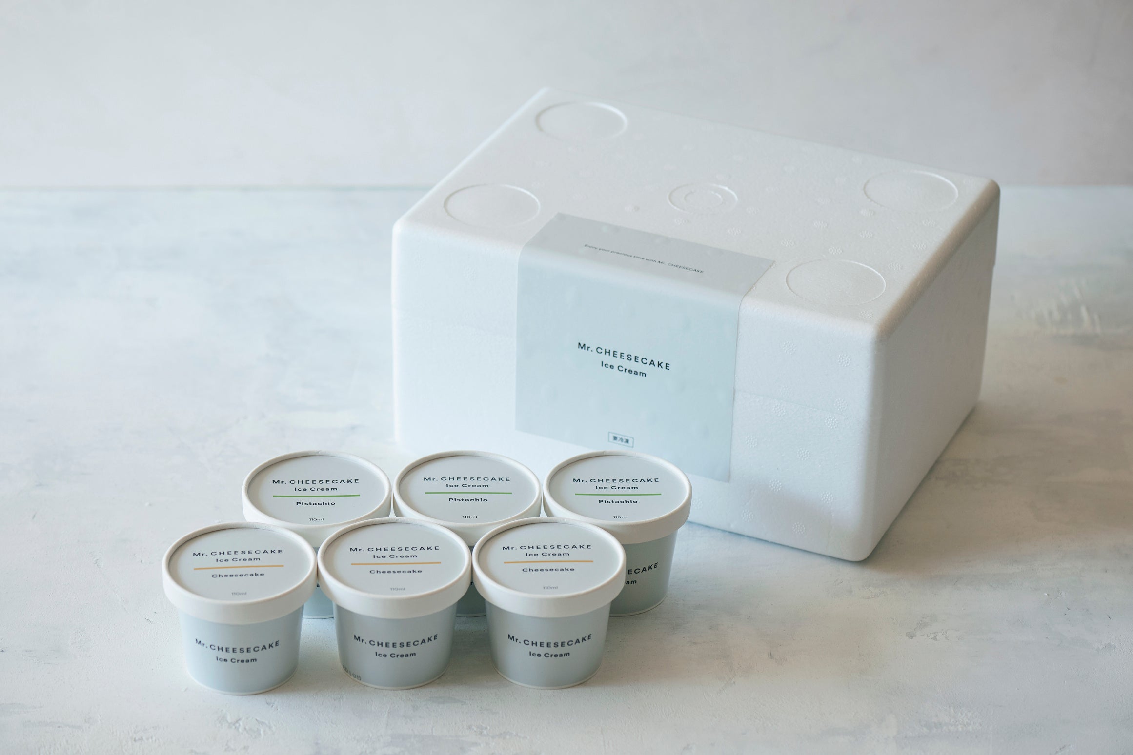 Mr. CHEESECAKEの通常フレーバーをイメージした「Mr. CHEESECAKE Ice Cream Cheesecake」と、ピスタチオをふんだんに使用した「Mr. CHEESECAKE Ice Cream Pistachio」の2フレーバーを3個ずつセットにしてお届けします。