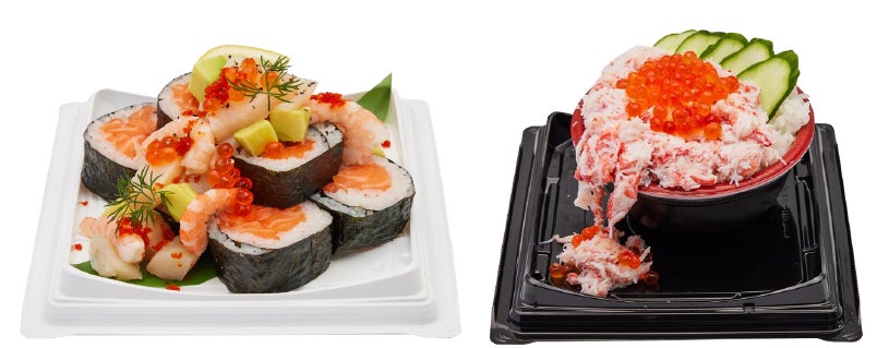 ▲左:その日一番旨い魚で巻きます!「まみれ巻きタワー」 右:大漁につき、あふれました!「こぼれカニ丼」