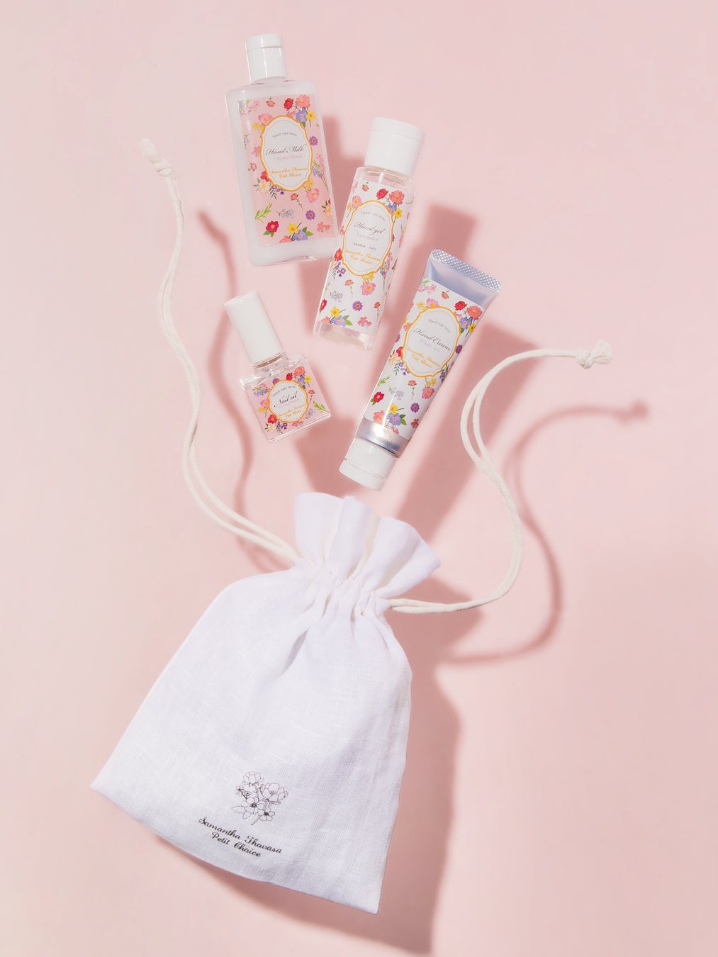 サマンサタバサプチチョイスのレザーアイテムとお揃いのオリジナルのフラワーデザインでラッピングされたハンドケアアイテムが登場。ラインナップはハンドクリーム、ハンドミルク、ネイルオイル、ハンドジェルの4種類。