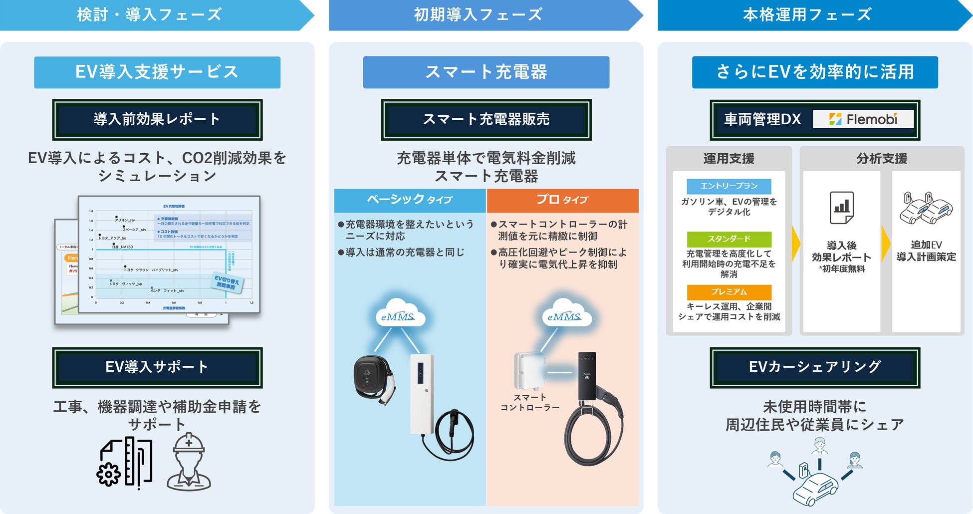 今回のリニューアルにより、REXEVでは法人EV向けサービスを「EV導入支援」、「スマート充電器」、「Flemobi/カーシェア」の3つのステップで提供いたします。お客様のEVの導入目的や段階に合わせて、EV導入前レポートや最適なEV充電器の選定、EV運用・分析、車両管理DXと連携したエネルギーマネジメントを提供し、お客様のニーズに合わせたEVの最適な運用方法をご提案いたします。