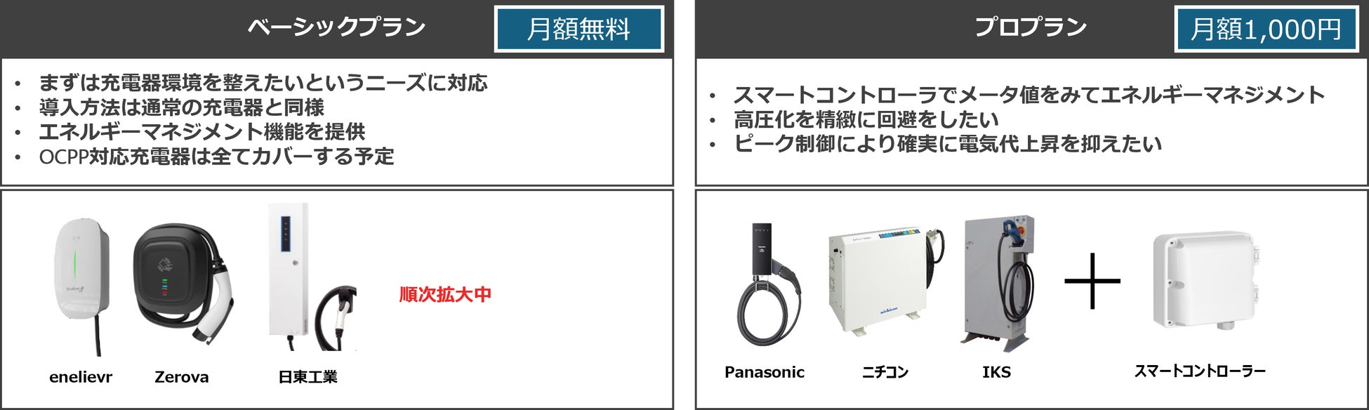 2023年5月にリリースをしたスマート充電器に、30分ごとの電気料金に応じて安価な時間帯で充電する価格連動制御機能を新たに搭載しました。また、より手軽にスマート充電器の利便性と効果を実感していただくために、通常の充電器と導入方法、コストは変わらず、かつ月額利用料無料のスマート充電器(ベーシックタイプ)の提供を開始します。ベーシックタイプをよりアップグレードした精緻な制御が可能なプロタイプもご用意しています。