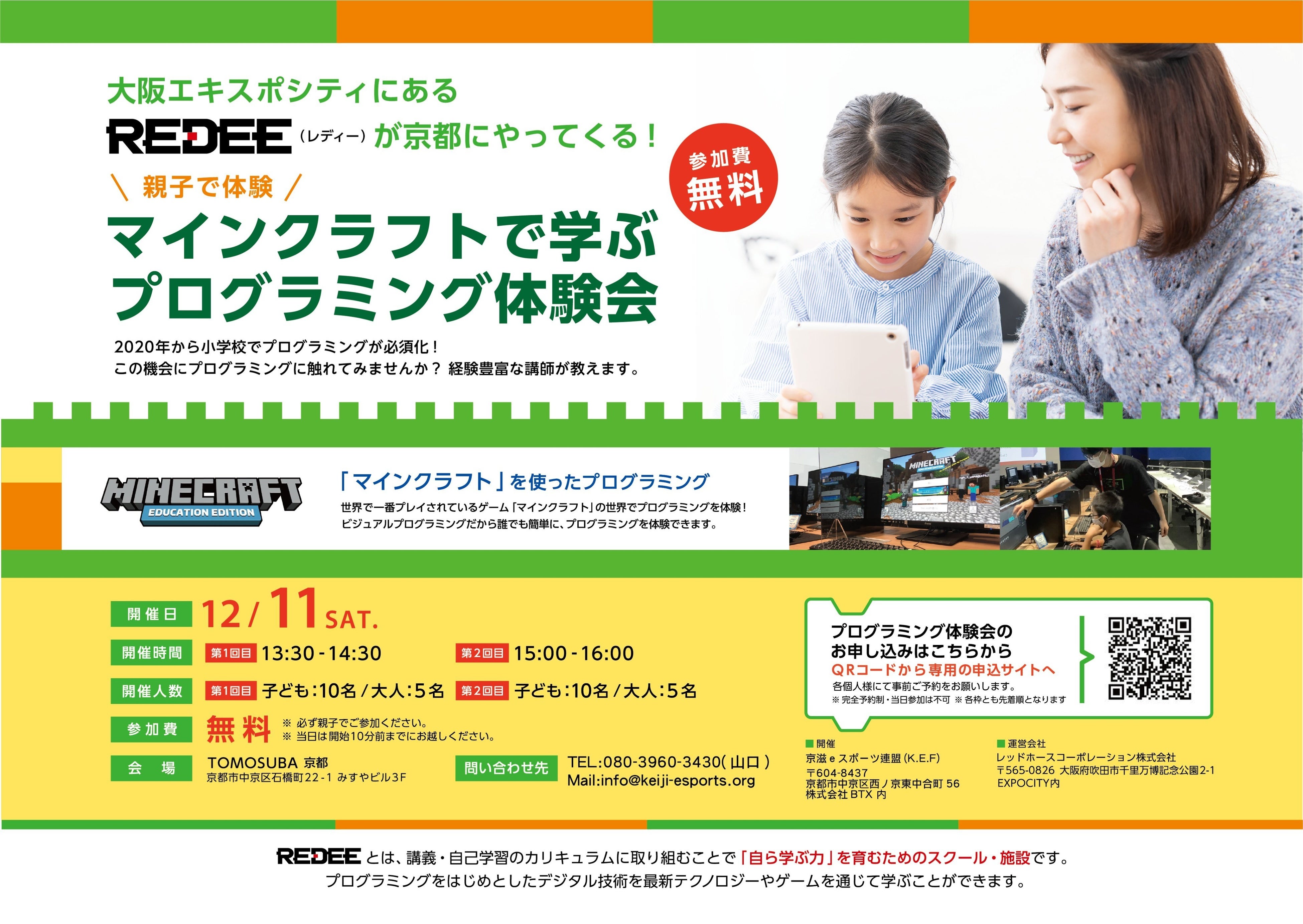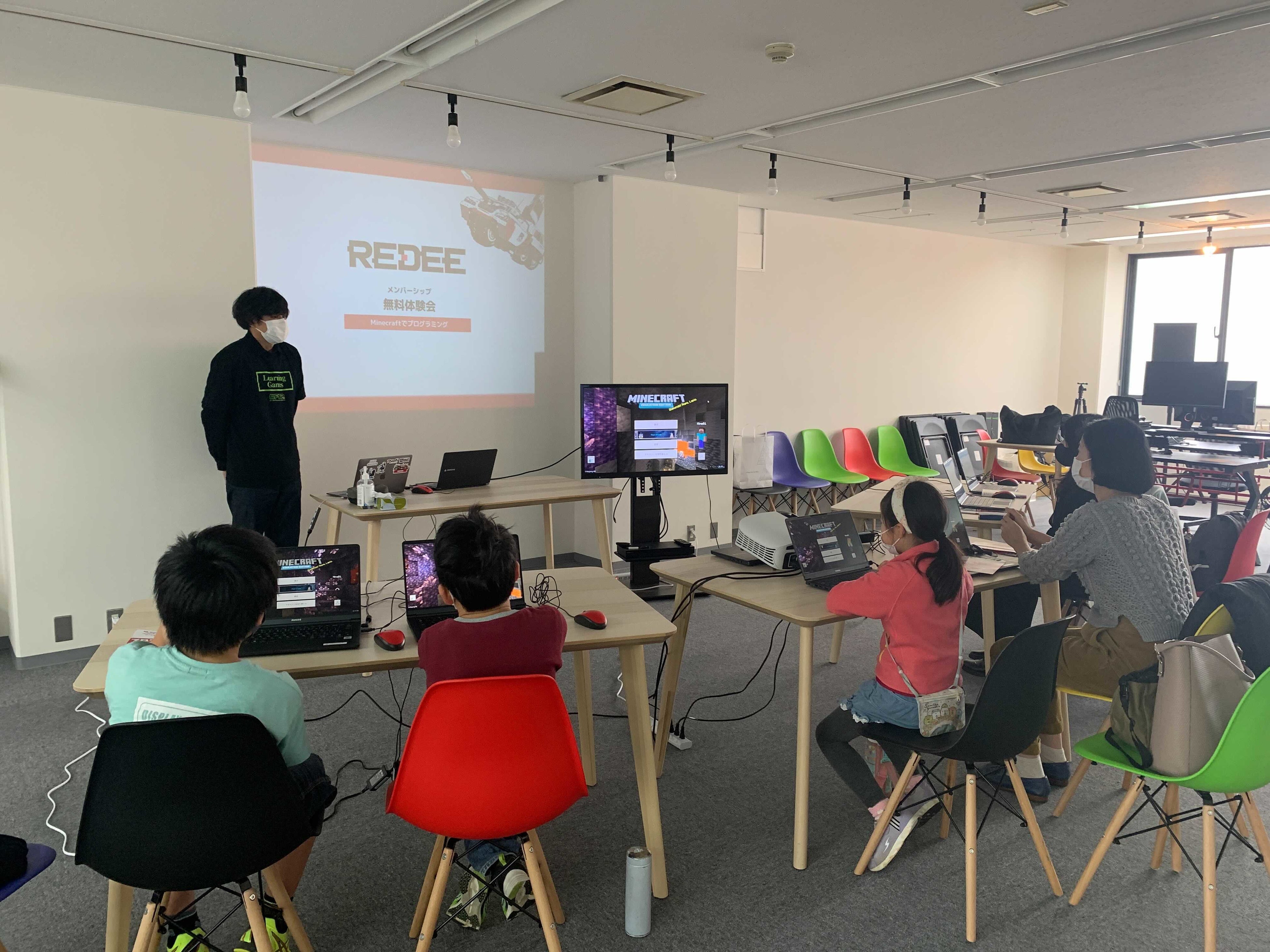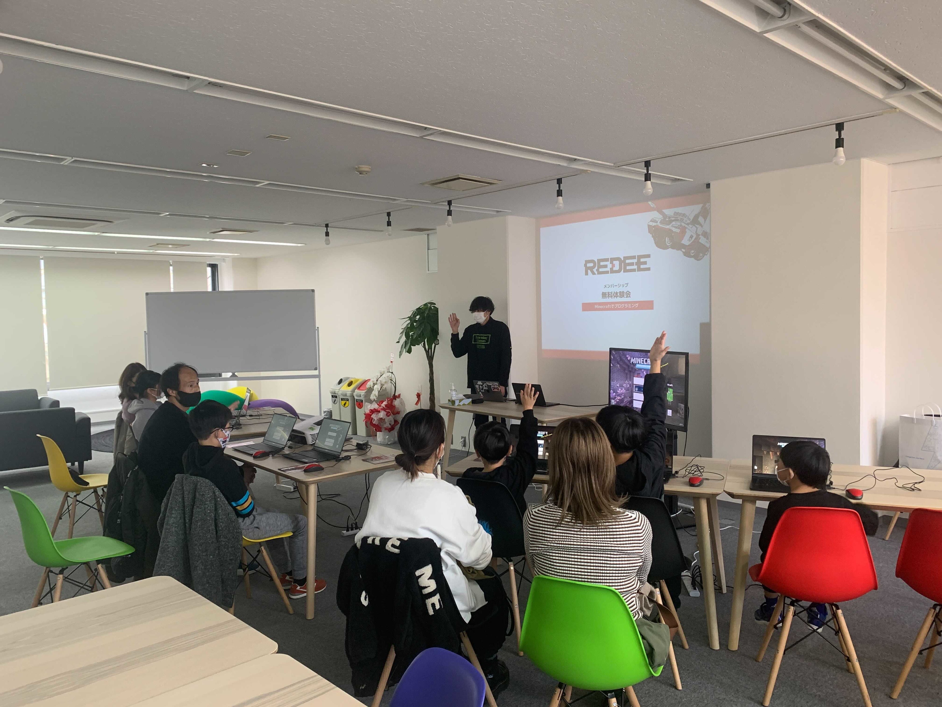 2021年12月11日(土)、「REDEE」の出張プログラミング無料体験会を京都で開催しました。今回は「REDEE」メンバーシップカリキュラムでも人気の「マインクラフト基礎」を小学校低学年〜中学生まで幅広い層に体験いただきました。全てのお子様に親御さんも付き添っての参加で、プログラミング教育への関心の高さを感じました。