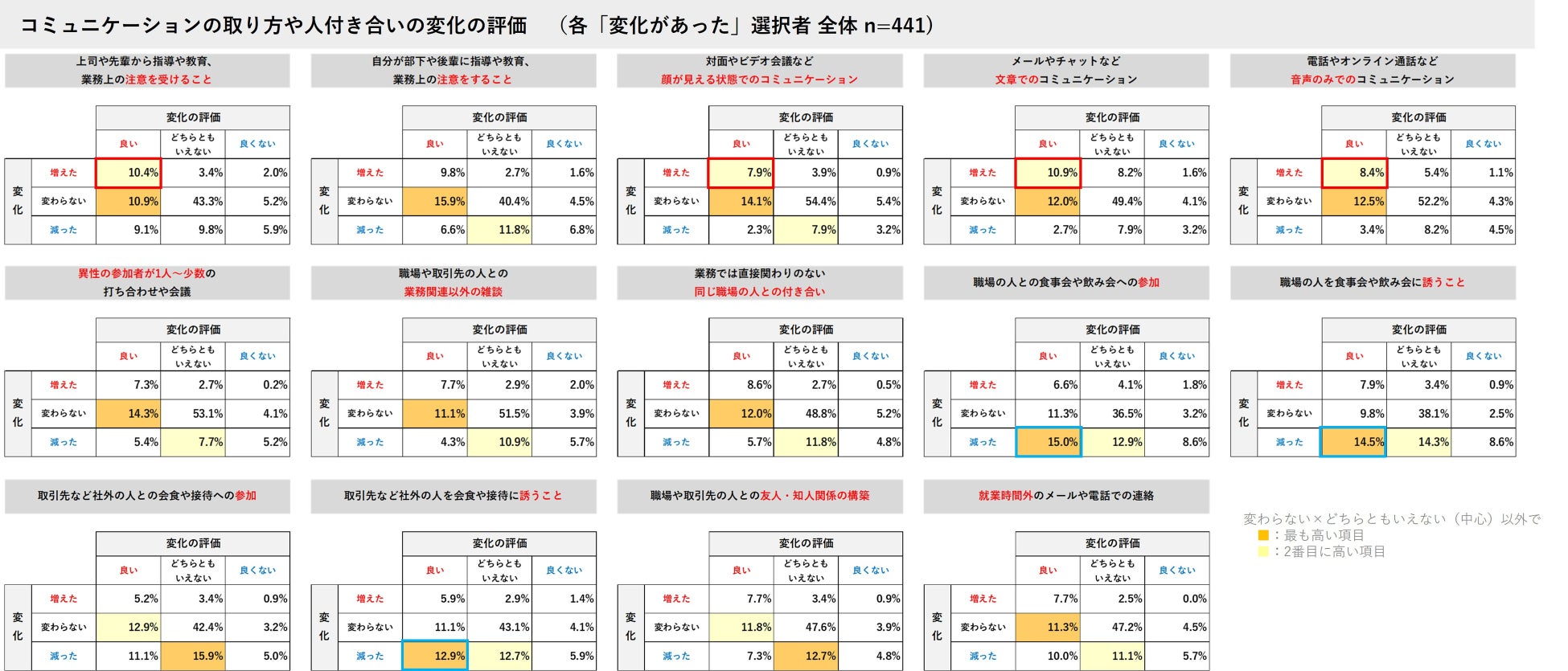コミュニケーションの変化とその評価の分布では、“増えたことが良い”との評価が上位に来るのは、「業務上の注意を受けること」や「顔が見える状態でのコミュニケーション」な一方で、「文章」や「音声のみ」のコミュニケーションも“増えたことが良い”が上位に入っています。対して、コミュニケーションが「減った」で上位だった“会食”関連では、「職場の人との食事会や飲み会」に“参加”・“誘うこと”と、「取引先など社外の人を会食や接待」に“誘うこと”で、“減ったことが良い”との評価が上位に入りました。