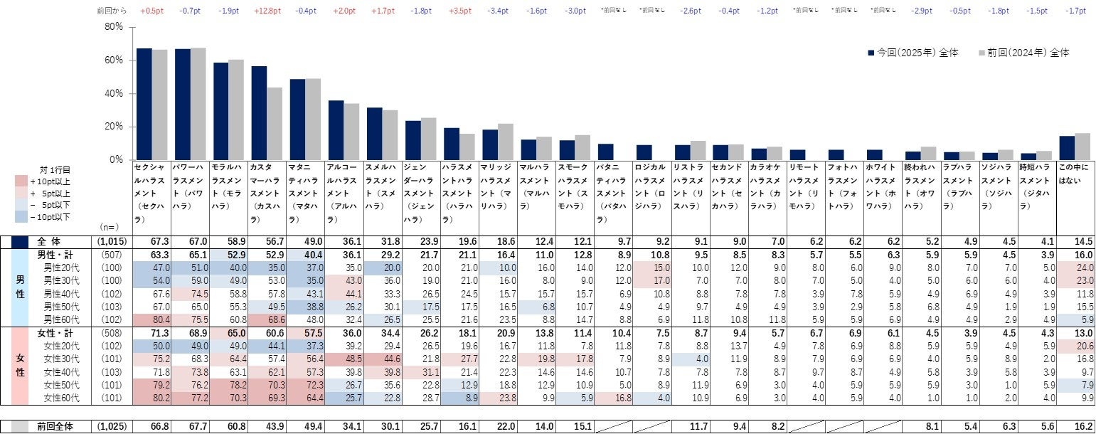 1.ハラスメント行為の認知・経験は前回に引き続き「セクハラ」「パワハラ」「モラハラ」が上位。前回(2024年調査)よりも「カスハラ」の認知が大きく上昇。
