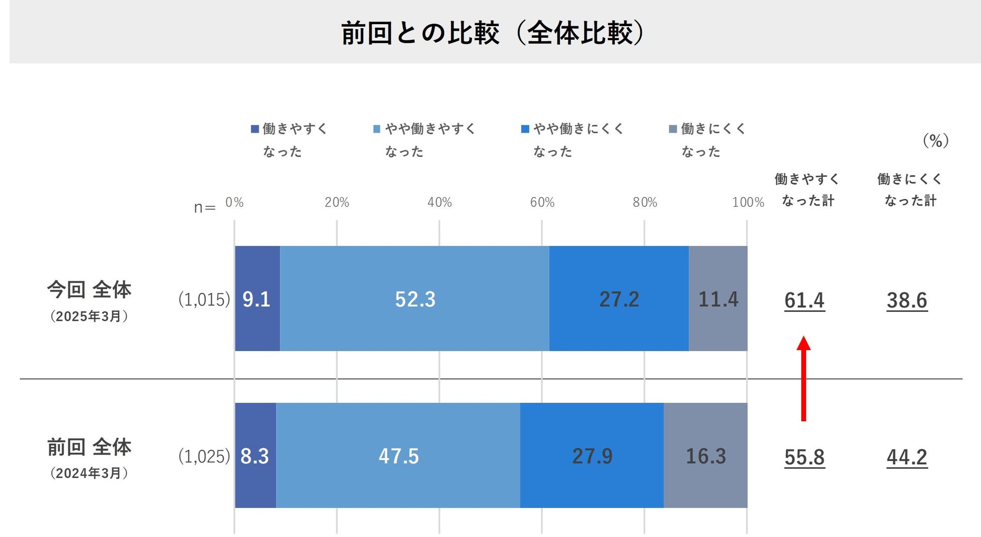 2.ハラスメント意識の高まりにより、全体の61.4%が「働きやすくなった」と回答。前回(2024年調査)55.8%から5.6ptの上昇。