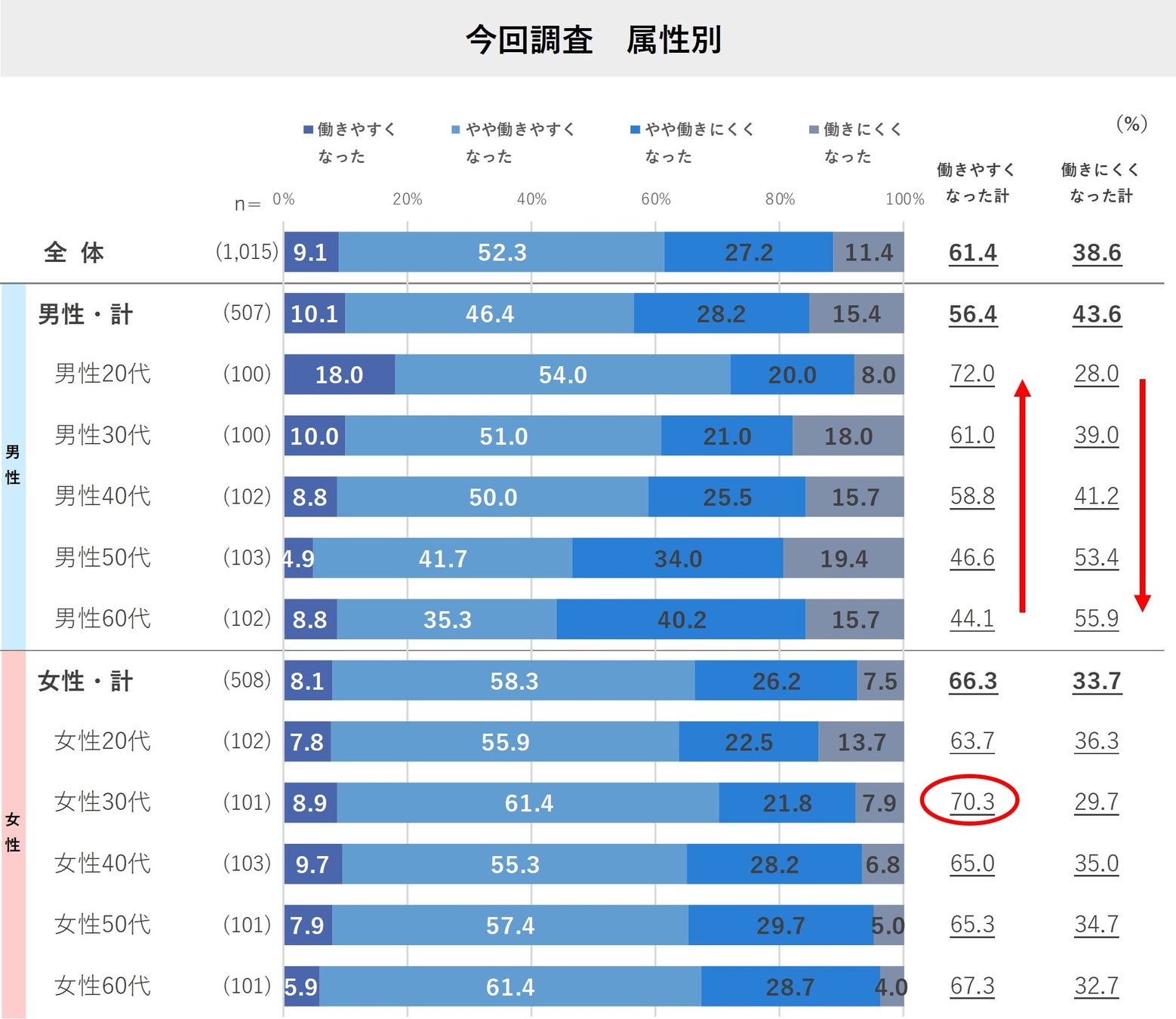 「働きやすくなった」との実感は女性で高く、女性は各年代それぞれ6割以上が「働きやすくなった」と回答。一方、男性は若年層では「働きやすくなった」との回答が高いものの、年代が上がるにつれて「働きにくくなった」との回答が増える傾向。