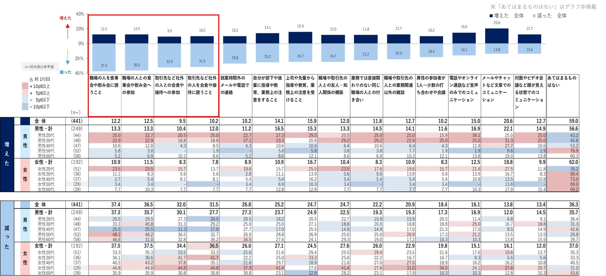 コミュニケーションの変化は、「減った」コミュニケーションが多く、「増えた」コミュニケーションが多いのは「文章でのコミュニケーション」のみでした。「減った」のは職場の人、取引先問わず、会食や飲み会に“参加すること”・“誘うこと”それぞれが30~40%と大きく減少しています。「メールやチャットなど文章でのコミュニケーション」が増えたのは男女それぞれ若年層で高めになっています。