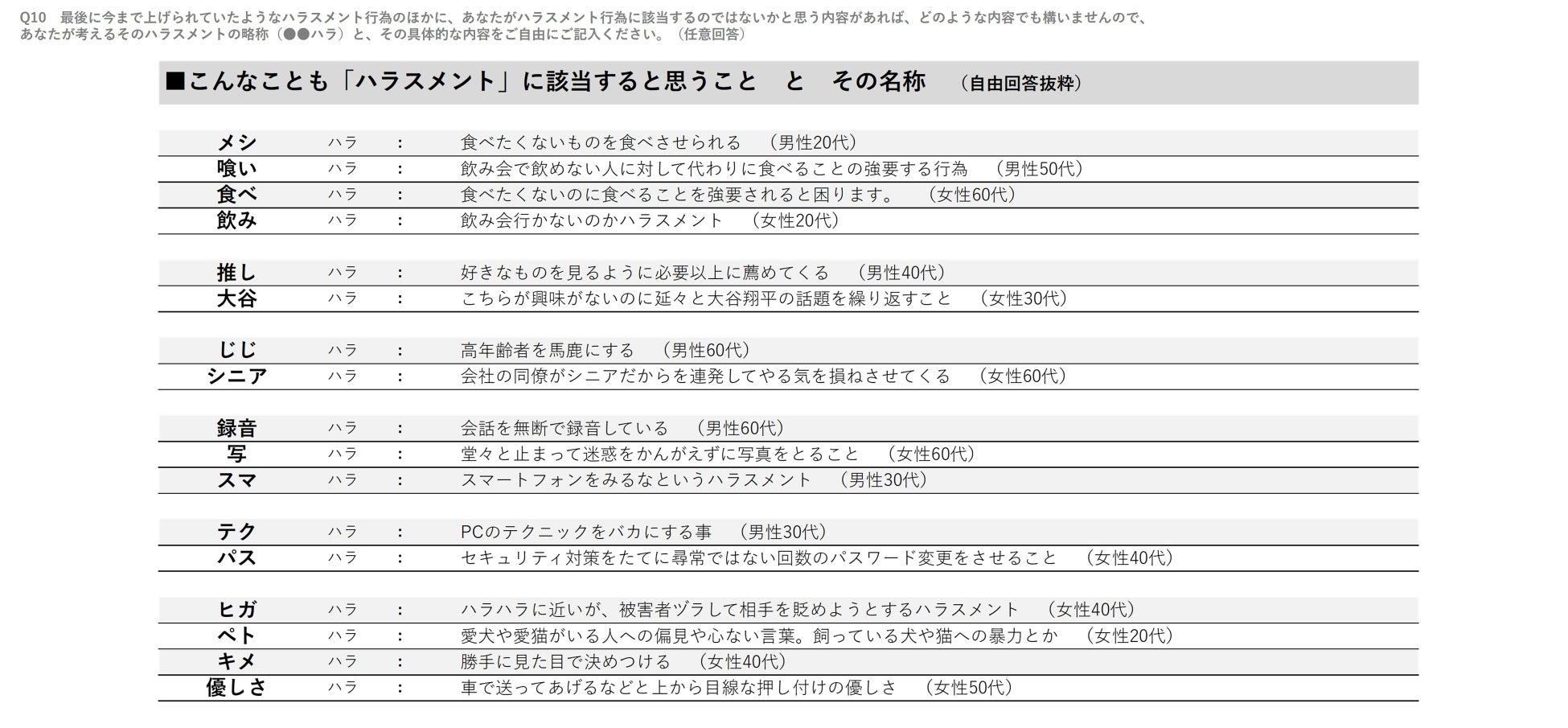 既存のハラスメント行為以外にも、「ハラスメント」に該当すると思う行為では、食事に関する行為(メシハラ・喰いハラ・食べハラなど)が散見されたほか、好きなものや流行りのものを勧めるような行為(推しハラ・大谷ハラ)、高齢者に対する行為(じじハラ・シニアハラ)や、スマートフォンの使用に関する行為(録音ハラ・写ハラ・スマハラ)なども挙げられました。