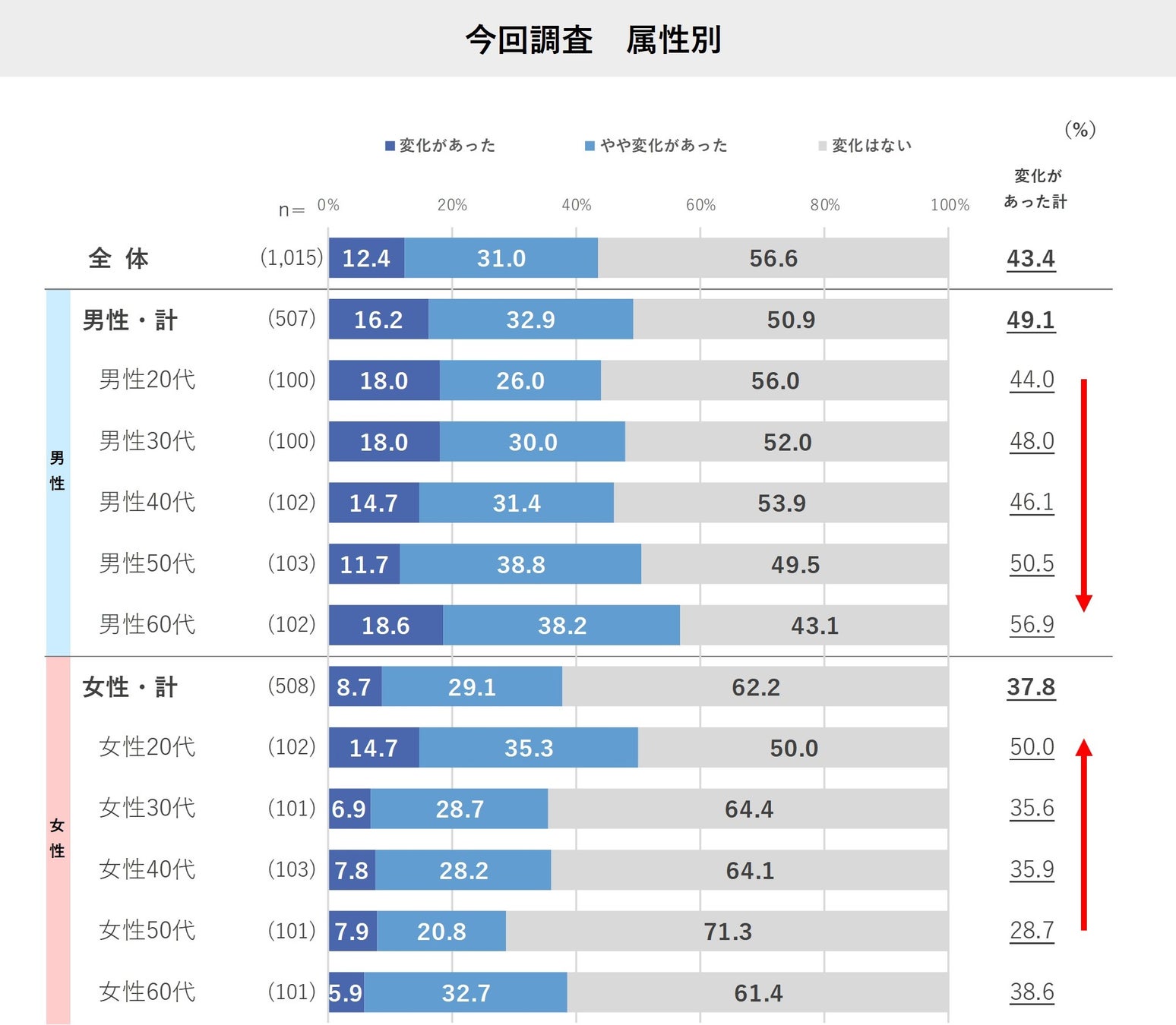 職場でのコミュニケーションの変化は、「変化があった」が12.4%、「やや変化があった」を合わせた「変化があった計」は43.4%でした。男性は女性に比べて変化を感じている層が多く、また年代とともに増加する傾向が見られ、男性20代では44.0%に対し、男性60代では56.9%が変化を感じています。一方、女性では反対に若年層の方が変化を感じている様子が高く、女性20代では半数が変化を感じています。