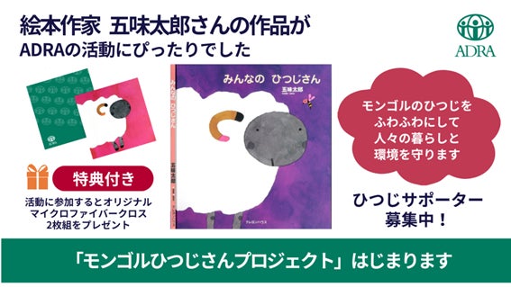 ADRA]では、毎月1,500円(1日あたり50円)の継続寄付でモンゴルの遊牧民の暮らしと草原を守る「ADRAひつじサポーター」を365人募集しています。ご登録いただいた方には、五味太郎さんの絵本にちなんだ特別なアイテムをプレゼントいたします。