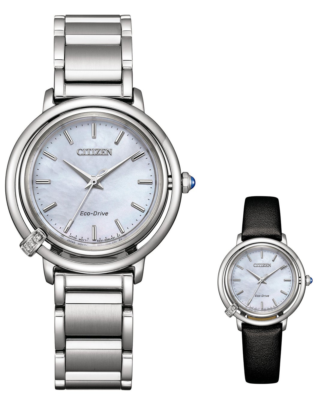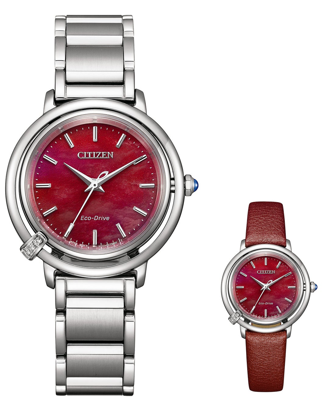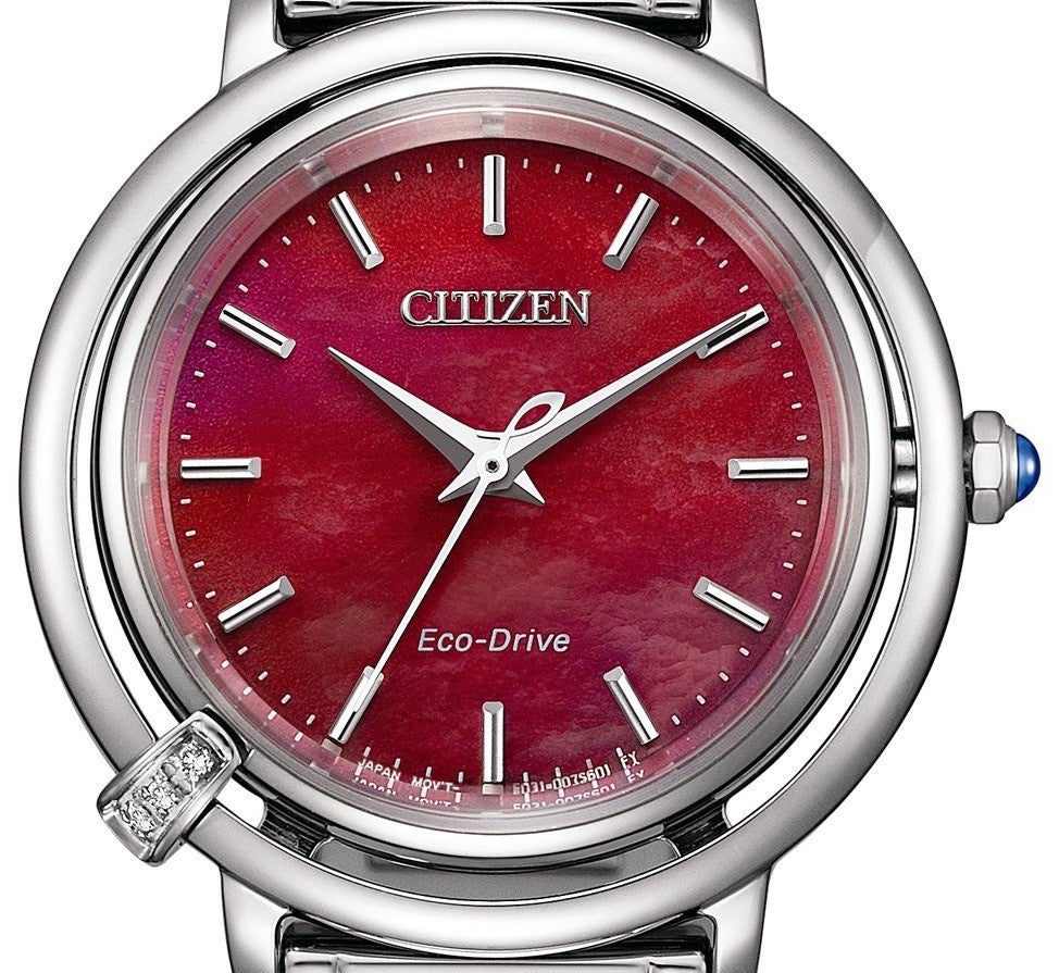 ケースと周囲のリングをつなぐように3ポイントのダイヤモンドが連なるオーナメントを配し、日の出の最初の閃光が走る様子を表現しています。文字板は、光の放射を表現したインデックスと切分を配し、視認性を確保しています。りゅうずには、美しい地球を想う『シチズン エル』のアイコンである爽やかなブルーがアクセントになっているりゅうずを採用しました。新たな始まりの瞬間のインスピレーションのように、腕元を見るたびにエネルギーに満ち溢れ、自信と強さを与えてくれるデザインです。全てのモデルに、メタルバンドとアップルレザー※1のストラップを簡単に付け替えることのできるインターチェンジャブル構造のバンドを採用しています。