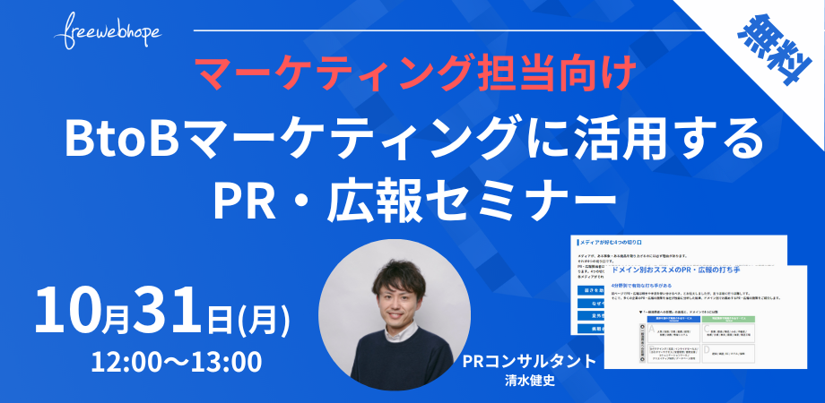 株式会社free web hope(本社:東京都千代田区、代表取締役:相原ゆうき)は、無料のオンラインセミナー「BtoBマーケティングに活用するPR・広報セミナー」を10月31日(月)に開催いたします。(申し込みサイト:https://share.hsforms.com/1ay-eQG5gQJKo3fkeHcA4Vw5fwo5)