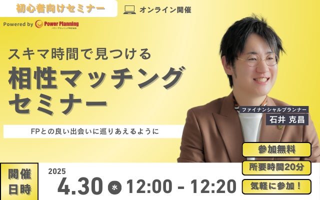 4月30日(水) 12時より、スキマ時間を活用して自分に合ったFPを探すことができる、石井克昌講師との「相性マッチングセミナー(無料)」を開催いたします。